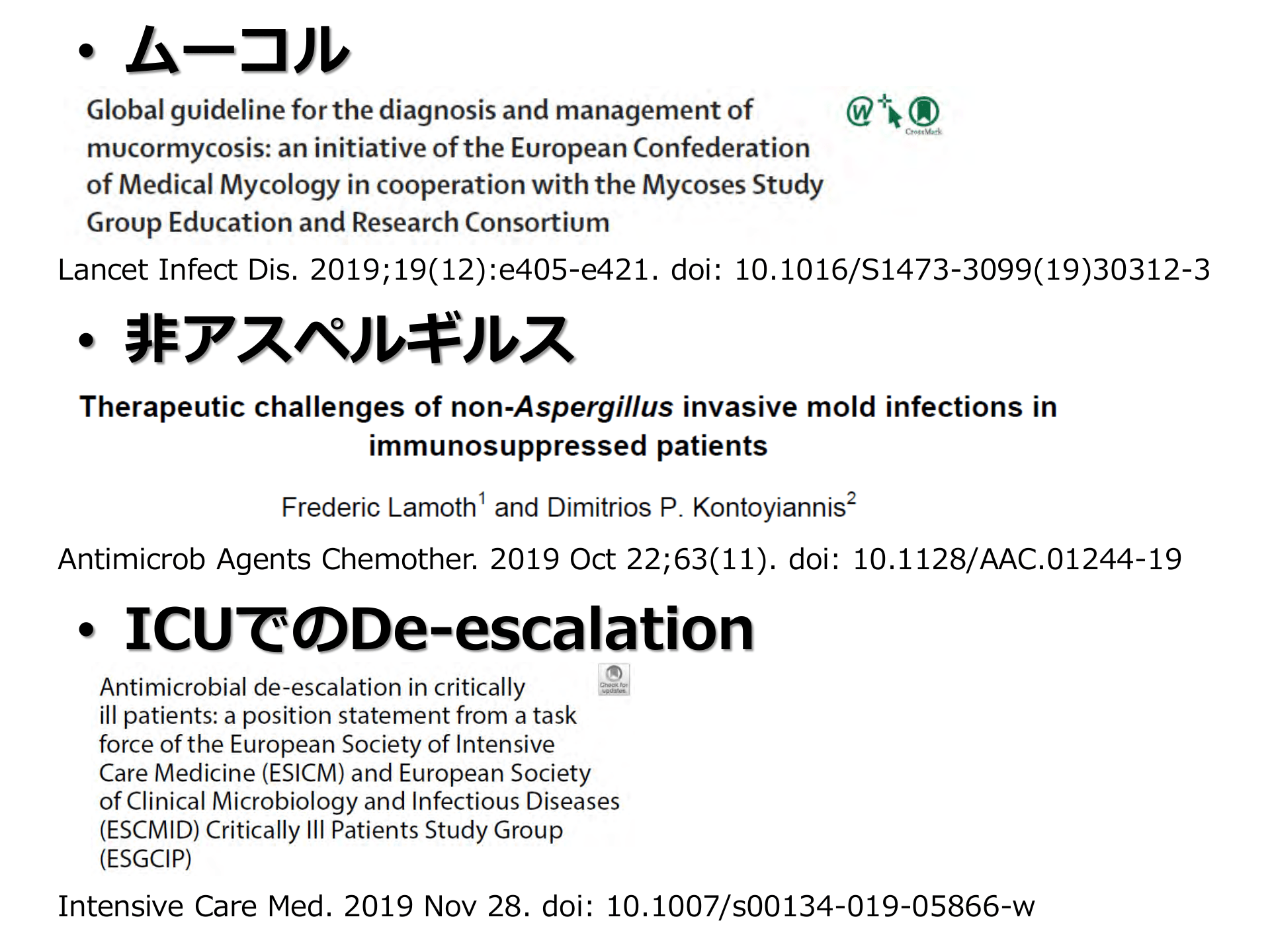 #150. • ムーコル Lancet Infect Dis. 2019;19(12):e405-e421. doi: 10.1016/S1473-3099(19)30312-3 • 非アスペルギルス Antimicrob Agents Chemother. 2019 Oct 22;63(11). doi: 10.1128/AAC.01244-19 • ICUでのDe-escalation Intensive Care Med. 2019 Nov 28. doi: 10.1007/s00134-019-05866-w