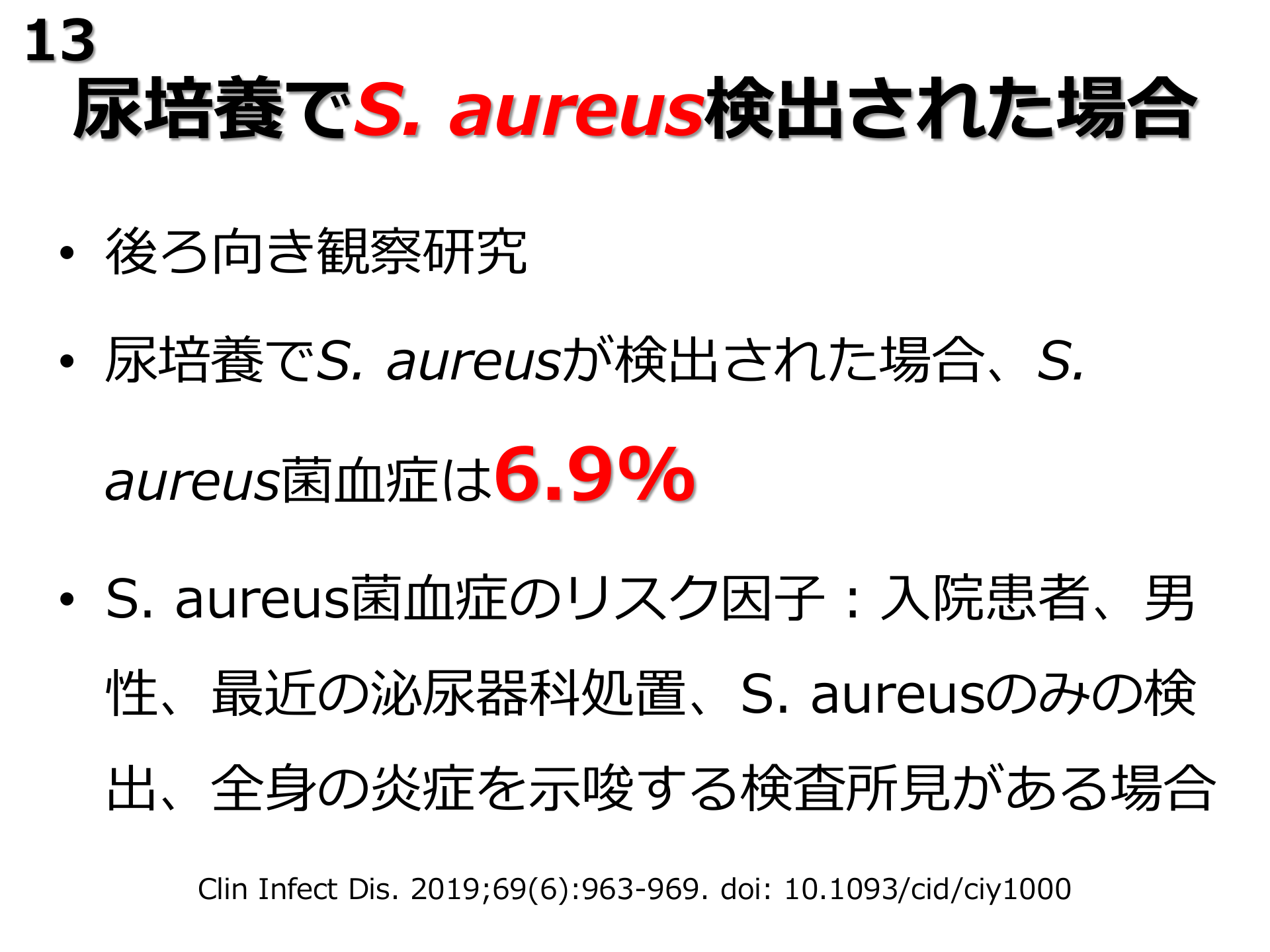 #18. 13 尿培養でS. aureus検出された場合 • 後ろ向き観察研究 • 尿培養でS. aureusが検出された場合、S. aureus菌血症は6.9% • S. aureus菌血症のリスク因子:入院患者、男 性、最近の泌尿器科処置、S. aureusのみの検 出、全身の炎症を示唆する検査所見がある場合 Clin Infect Dis. 2019;69(6):963-969. doi: 10.1093/cid/ciy1000