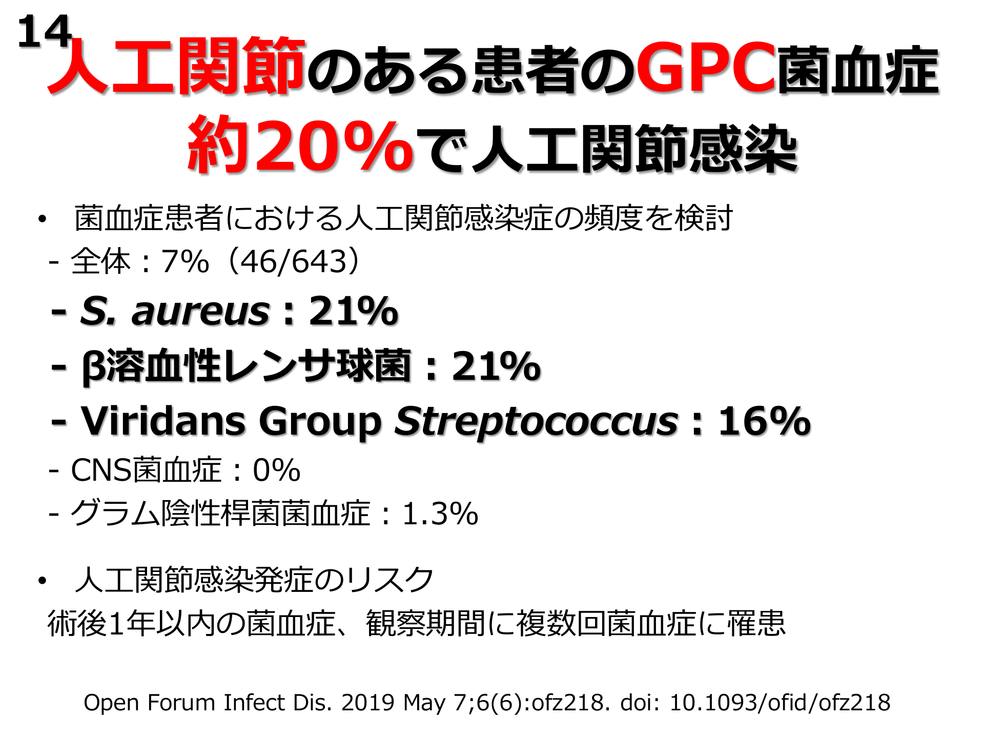 #19. 14 人工関節のある患者のGPC菌血症 約20%で人工関節感染 • 菌血症患者における人工関節感染症の頻度を検討 - 全体:7%(46/643) - S. aureus:21% - β溶血性レンサ球菌:21% - Viridans Group Streptococcus:16% - CNS菌血症:0% - グラム陰性桿菌菌血症:1.3% • 人工関節感染発症のリスク 術後1年以内の菌血症、観察期間に複数回菌血症に罹患 Open Forum Infect Dis. 2019 May 7;6(6):ofz218. doi: 10.1093/ofid/ofz218