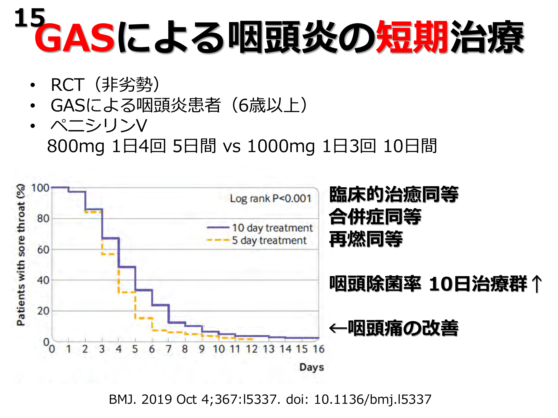 #21. 15 GASによる咽頭炎の短期治療 • RCT(非劣勢) • GASによる咽頭炎患者(6歳以上) • ペニシリンV 800mg 1日4回 5日間 vs 1000mg 1日3回 10日間 臨床的治癒同等 合併症同等 再燃同等 咽頭除菌率 10日治療群↑ ←咽頭痛の改善 BMJ. 2019 Oct 4;367:l5337. doi: 10.1136/bmj.l5337