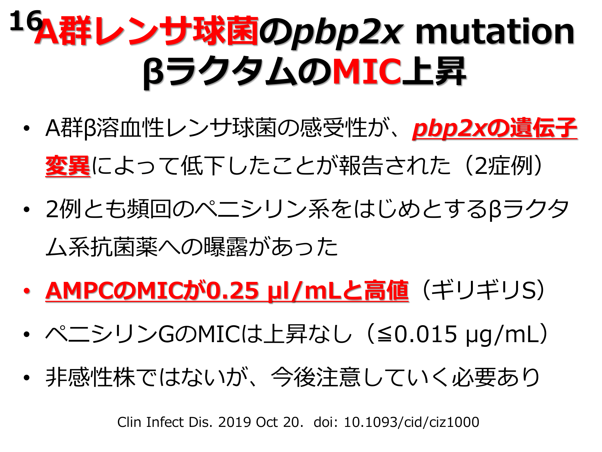 #22. 16A群レンサ球菌のpbp2x mutation βラクタムのMIC上昇 • A群β溶血性レンサ球菌の感受性が、pbp2xの遺伝子 変異によって低下したことが報告された(2症例) • 2例とも頻回のペニシリン系をはじめとするβラクタ ム系抗菌薬への曝露があった • AMPCのMICが0.25 µl/mLと高値(ギリギリS) • ペニシリンGのMICは上昇なし(≦0.015 µg/mL) • 非感性株ではないが、今後注意していく必要あり Clin Infect Dis. 2019 Oct 20. doi: 10.1093/cid/ciz1000