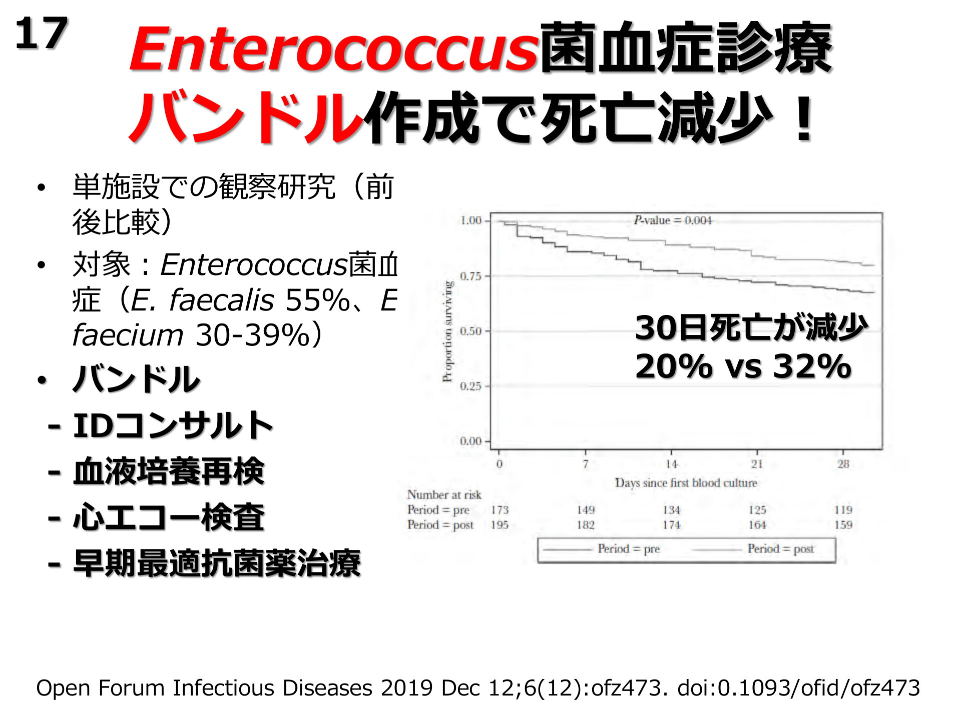 #24. 17 Enterococcus菌血症診療 バンドル作成で死亡減少! • 単施設での観察研究(前 後比較) • 対象:Enterococcus菌血 症(E. faecalis 55%、E. faecium 30-39%) • - バンドル IDコンサルト 血液培養再検 心エコー検査 早期最適抗菌薬治療 30日死亡が減少 20% vs 32% Open Forum Infectious Diseases 2019 Dec 12;6(12):ofz473. doi:0.1093/ofid/ofz473