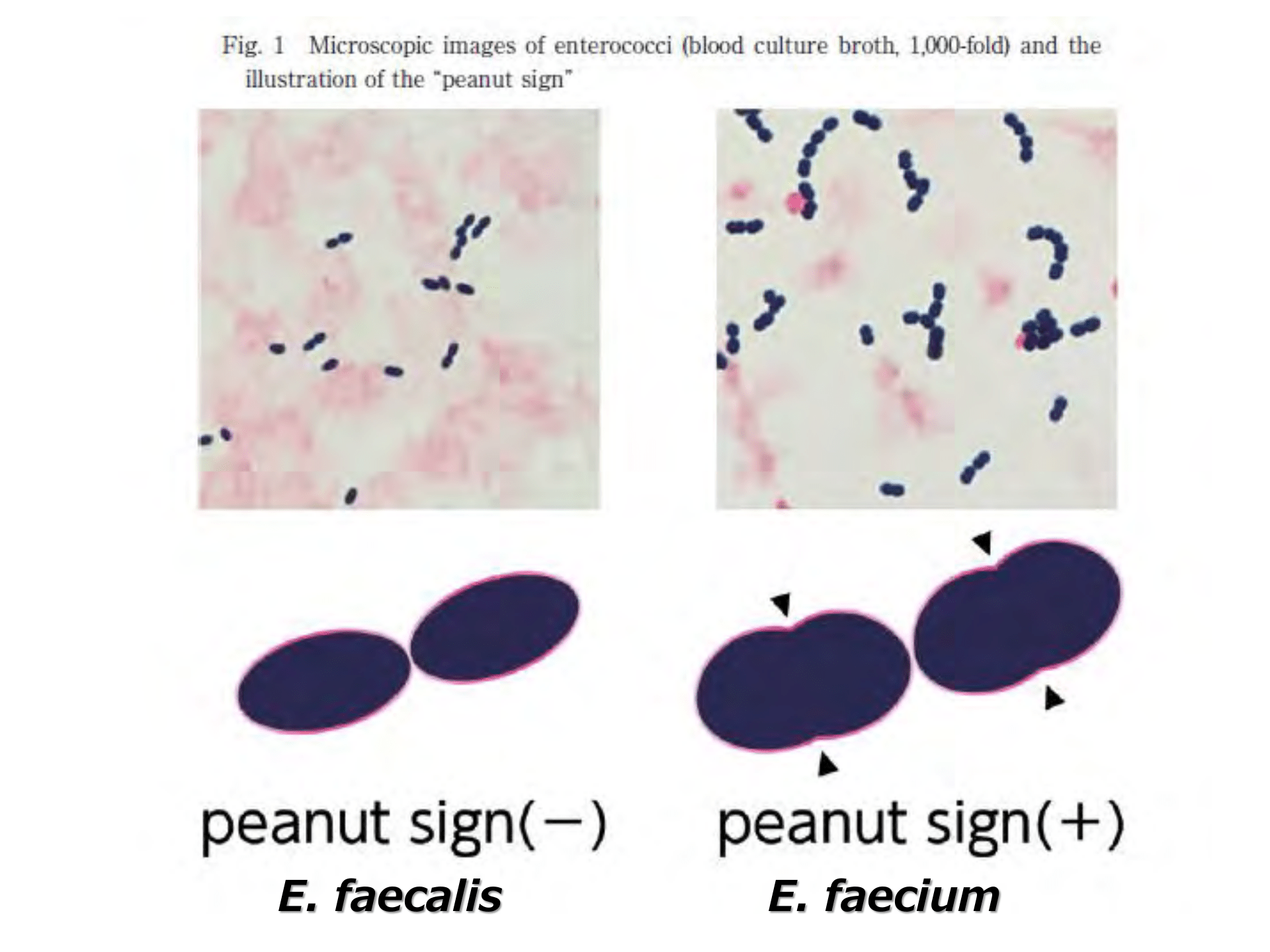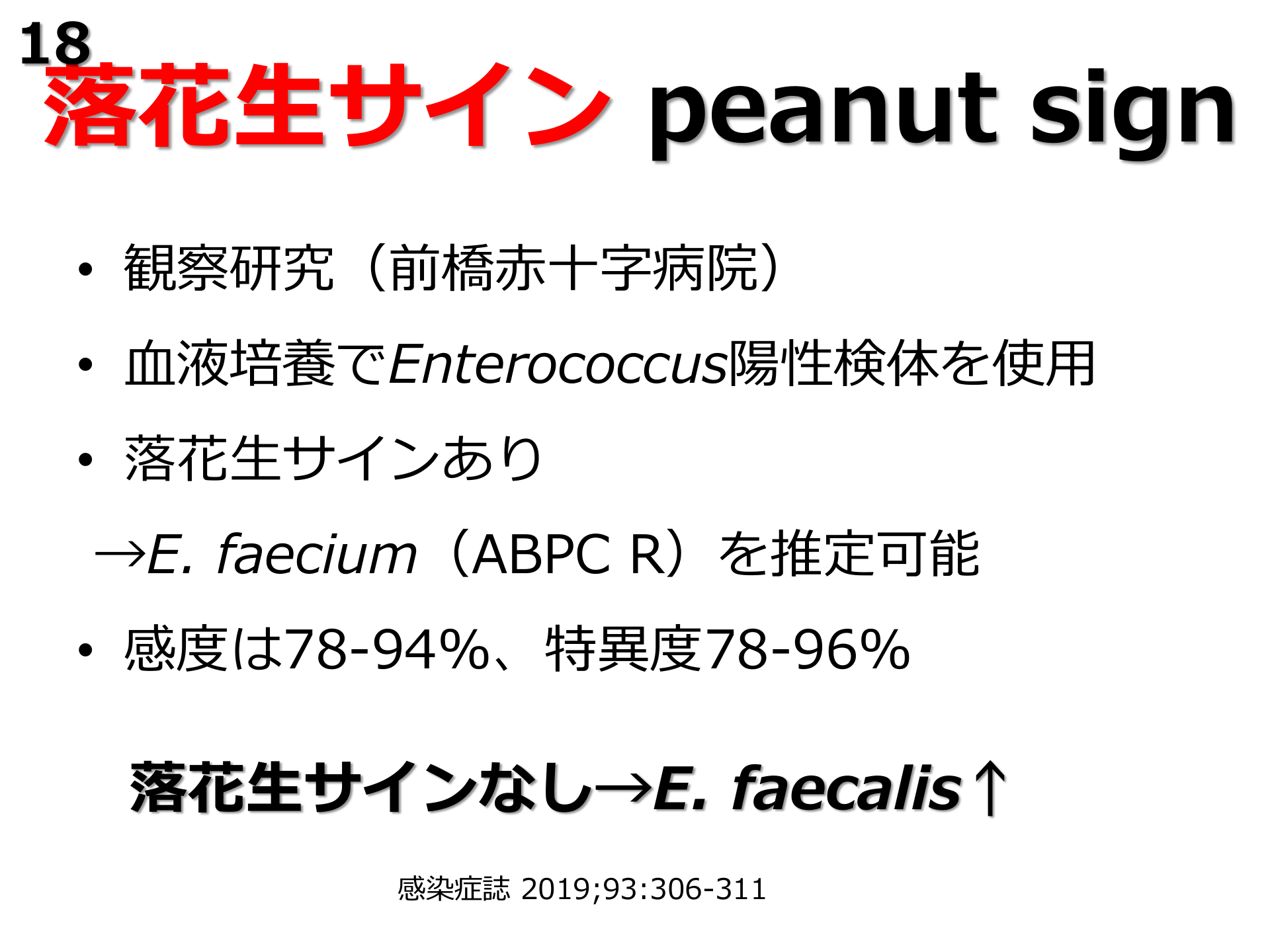 #25. 18 落花生サイン peanut sign • 観察研究(前橋赤十字病院) • 血液培養でEnterococcus陽性検体を使用 • 落花生サインあり →E. faecium(ABPC R)を推定可能 • 感度は78-94%、特異度78-96% 落花生サインなし→E. faecalis↑ 感染症誌 2019;93:306-311