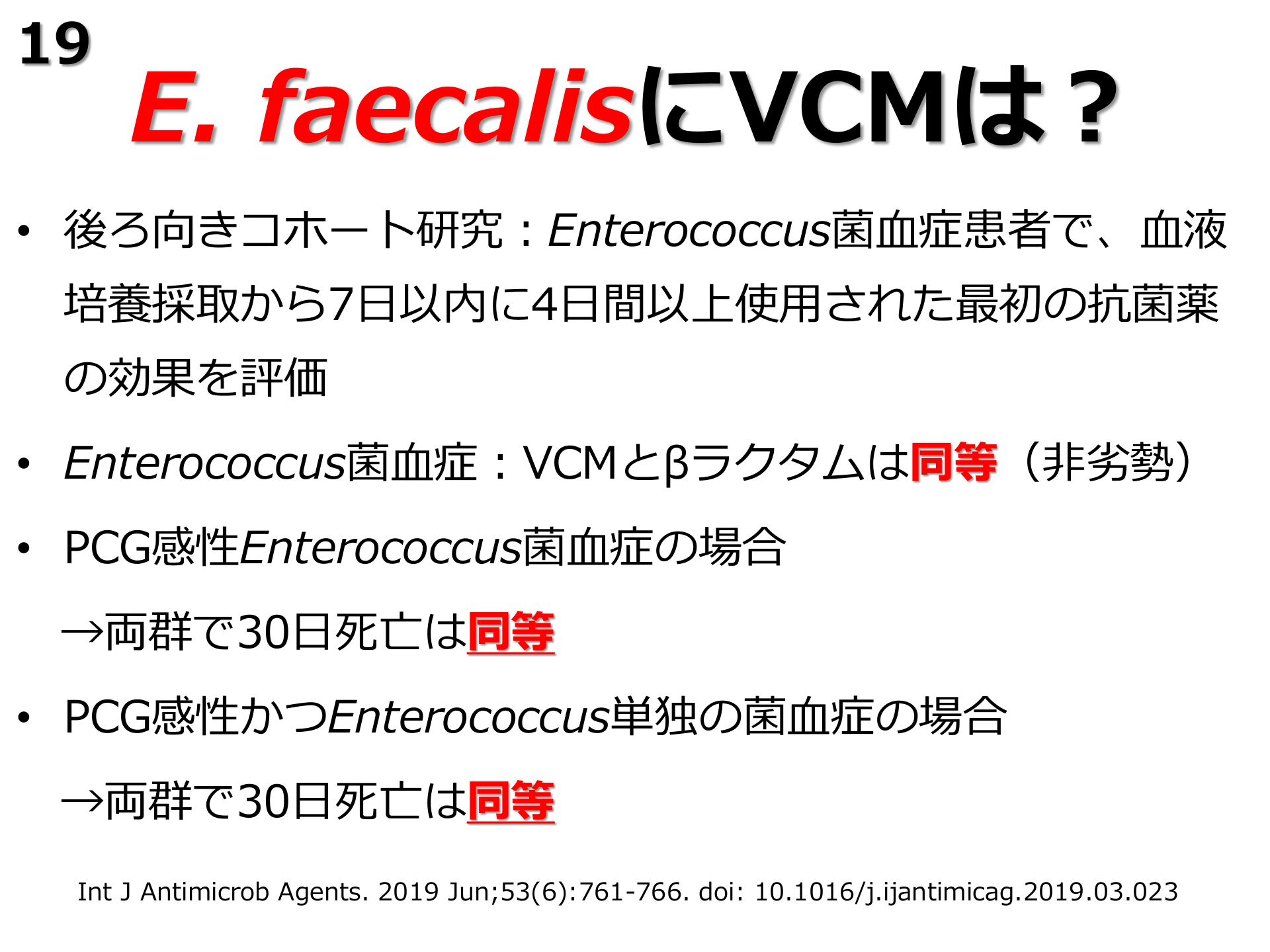 #27. 19 E. faecalisにVCMは? • 後ろ向きコホート研究:Enterococcus菌血症患者で、血液 培養採取から7日以内に4日間以上使用された最初の抗菌薬 の効果を評価 • Enterococcus菌血症:VCMとβラクタムは同等(非劣勢) • PCG感性Enterococcus菌血症の場合 →両群で30日死亡は同等 • PCG感性かつEnterococcus単独の菌血症の場合 →両群で30日死亡は同等 Int J Antimicrob Agents. 2019 Jun;53(6):761-766. doi: 10.1016/j.ijantimicag.2019.03.023