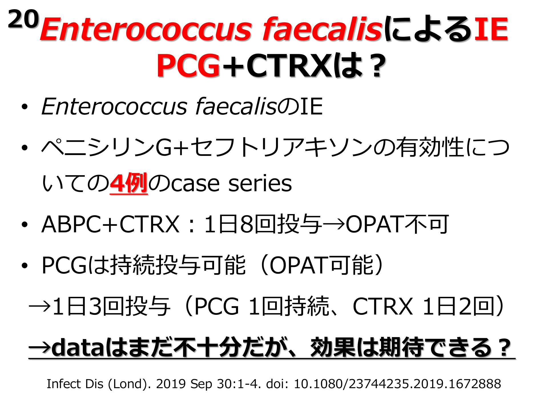 #28. 20 Enterococcus faecalisによるIE PCG+CTRXは? • Enterococcus faecalisのIE • ペニシリンG+セフトリアキソンの有効性につ いての4例のcase series • ABPC+CTRX:1日8回投与→OPAT不可 • PCGは持続投与可能(OPAT可能) →1日3回投与(PCG 1回持続、CTRX 1日2回) →dataはまだ不十分だが、効果は期待できる? Infect Dis (Lond). 2019 Sep 30:1-4. doi: 10.1080/23744235.2019.1672888