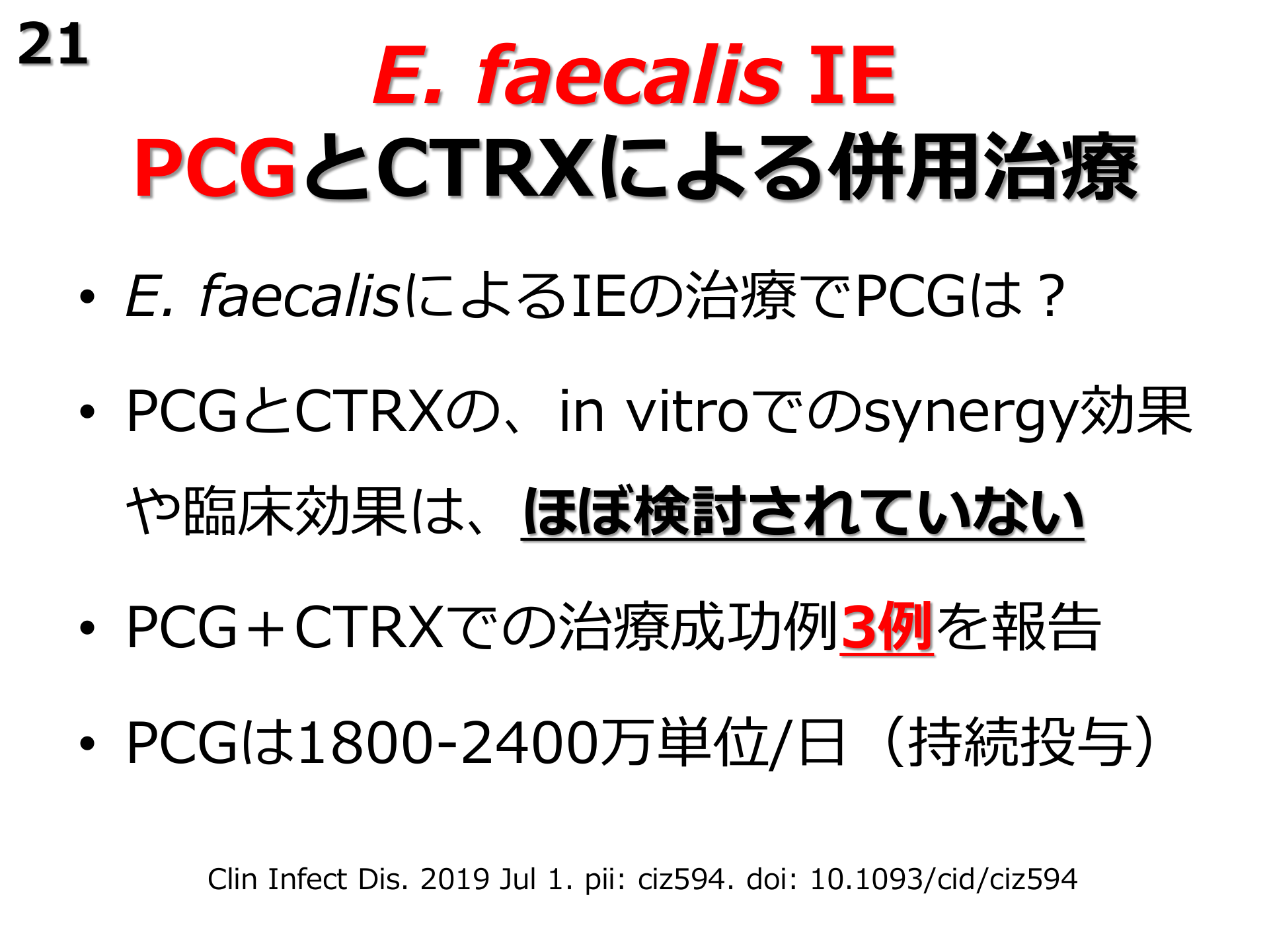 #29. 21 E. faecalis IE PCGとCTRXによる併用治療 • E. faecalisによるIEの治療でPCGは? • PCGとCTRXの、in vitroでのsynergy効果 や臨床効果は、ほぼ検討されていない • PCG+CTRXでの治療成功例3例を報告 • PCGは1800-2400万単位/日(持続投与) Clin Infect Dis. 2019 Jul 1. pii: ciz594. doi: 10.1093/cid/ciz594