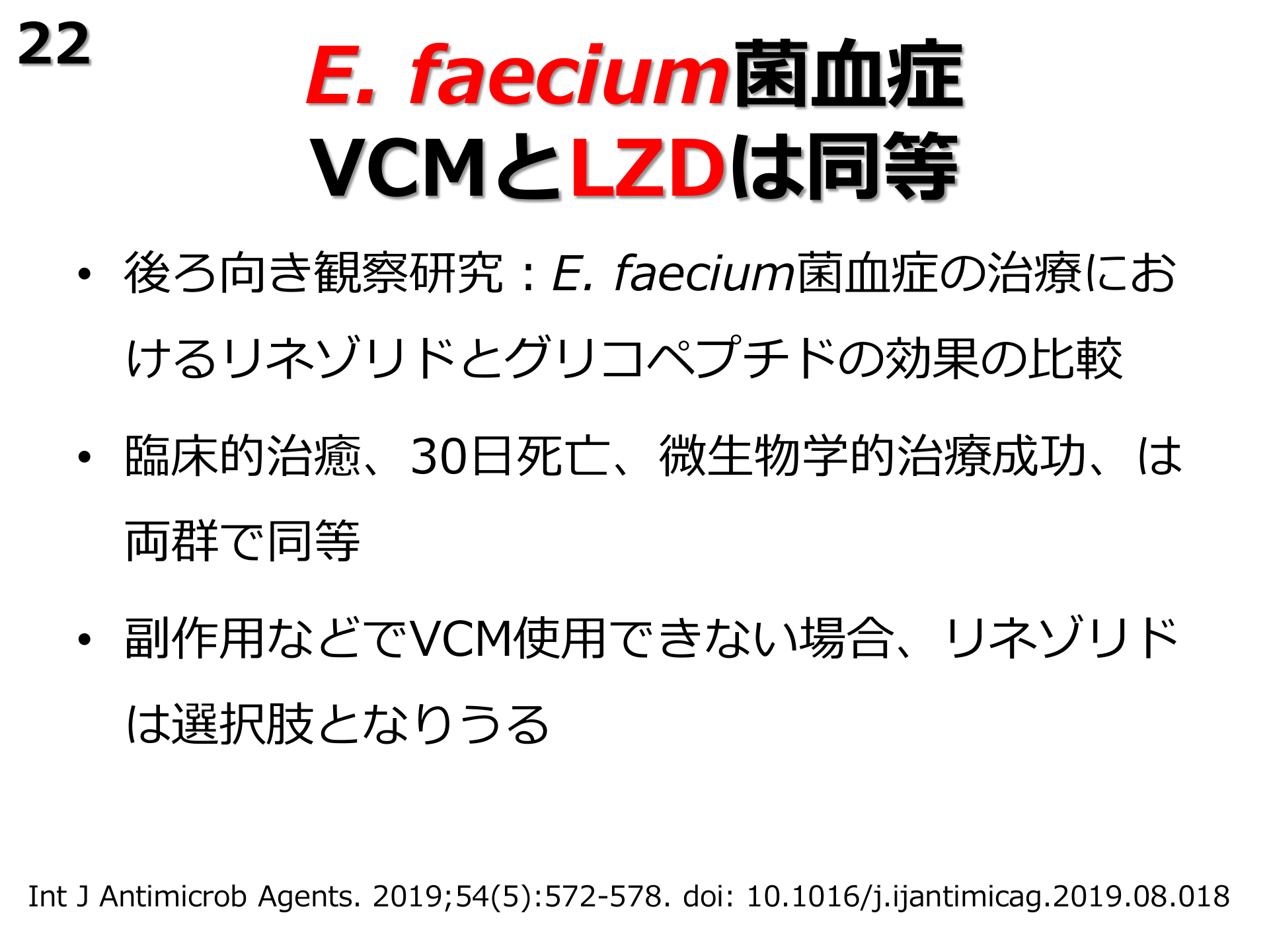 #30. 22 E. faecium菌血症 VCMとLZDは同等 • 後ろ向き観察研究:E. faecium菌血症の治療にお けるリネゾリドとグリコペプチドの効果の比較 • 臨床的治癒、30日死亡、微生物学的治療成功、は 両群で同等 • 副作用などでVCM使用できない場合、リネゾリド は選択肢となりうる Int J Antimicrob Agents. 2019;54(5):572-578. doi: 10.1016/j.ijantimicag.2019.08.018