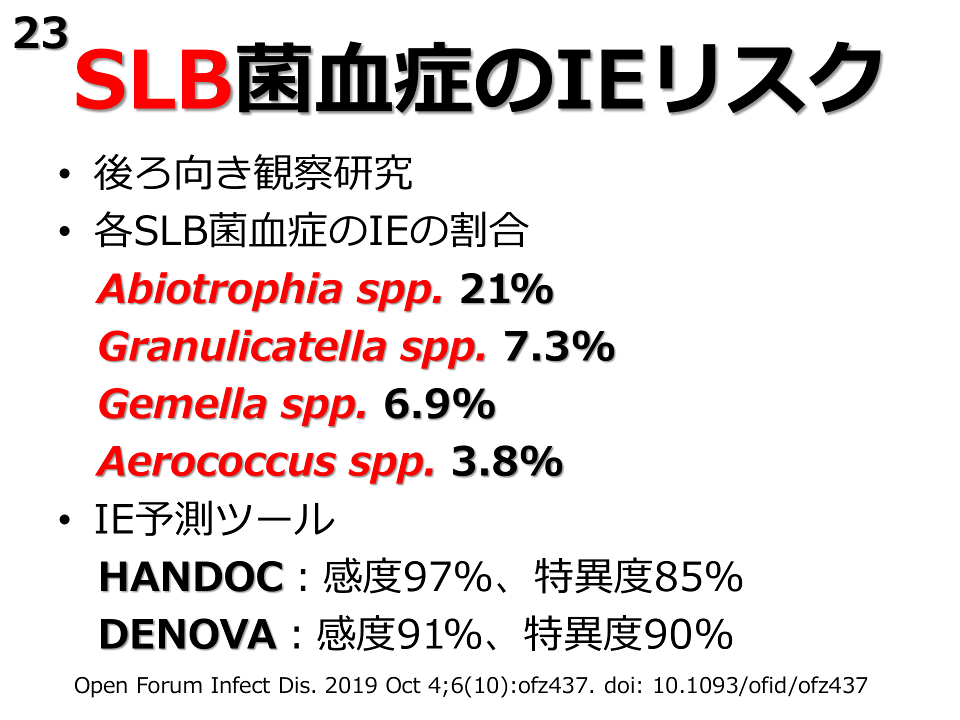 #32. 23 SLB菌血症のIEリスク • 後ろ向き観察研究 • 各SLB菌血症のIEの割合 Abiotrophia spp. 21% Granulicatella spp. 7.3% Gemella spp. 6.9% Aerococcus spp. 3.8% • IE予測ツール HANDOC:感度97%、特異度85% DENOVA:感度91%、特異度90% Open Forum Infect Dis. 2019 Oct 4;6(10):ofz437. doi: 10.1093/ofid/ofz437