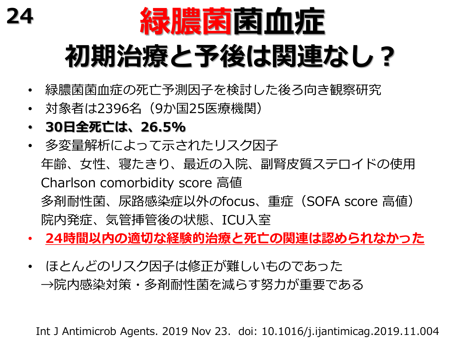 #34. 24 緑膿菌菌血症 初期治療と予後は関連なし? 緑膿菌菌血症の死亡予測因子を検討した後ろ向き観察研究 対象者は2396名(9か国25医療機関) 30日全死亡は、26.5% 多変量解析によって示されたリスク因子 年齢、女性、寝たきり、最近の入院、副腎皮質ステロイドの使用 Charlson comorbidity score 高値 多剤耐性菌、尿路感染症以外のfocus、重症(SOFA score 高値) 院内発症、気管挿管後の状態、ICU入室 • 24時間以内の適切な経験的治療と死亡の関連は認められなかった • • • • • ほとんどのリスク因子は修正が難しいものであった →院内感染対策・多剤耐性菌を減らす努力が重要である Int J Antimicrob Agents. 2019 Nov 23. doi: 10.1016/j.ijantimicag.2019.11.004
