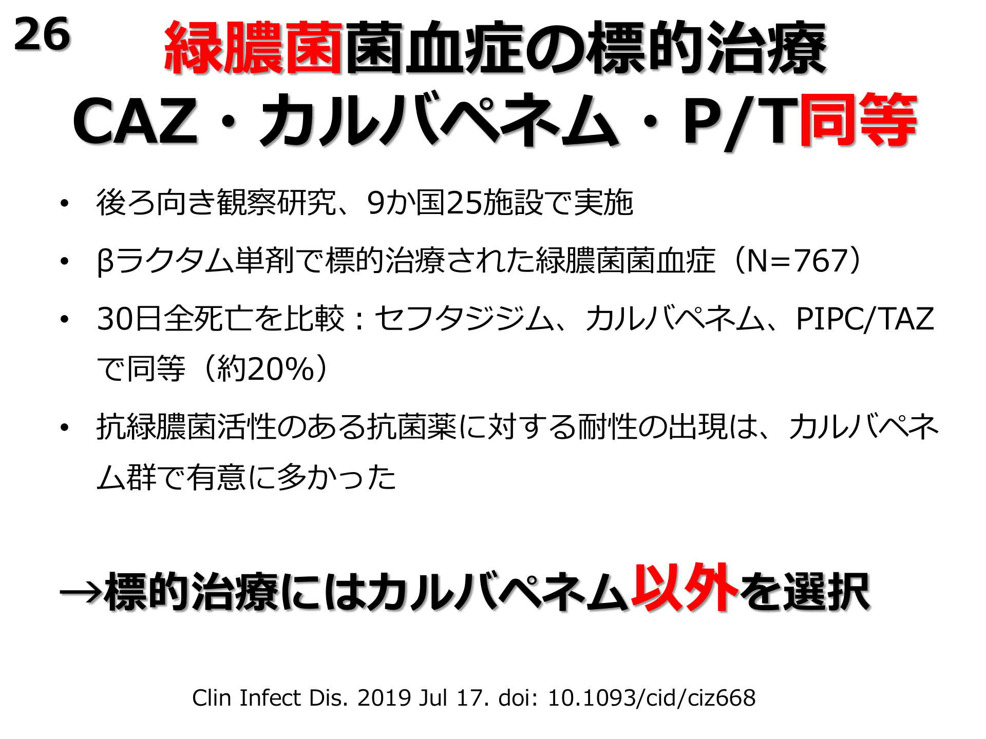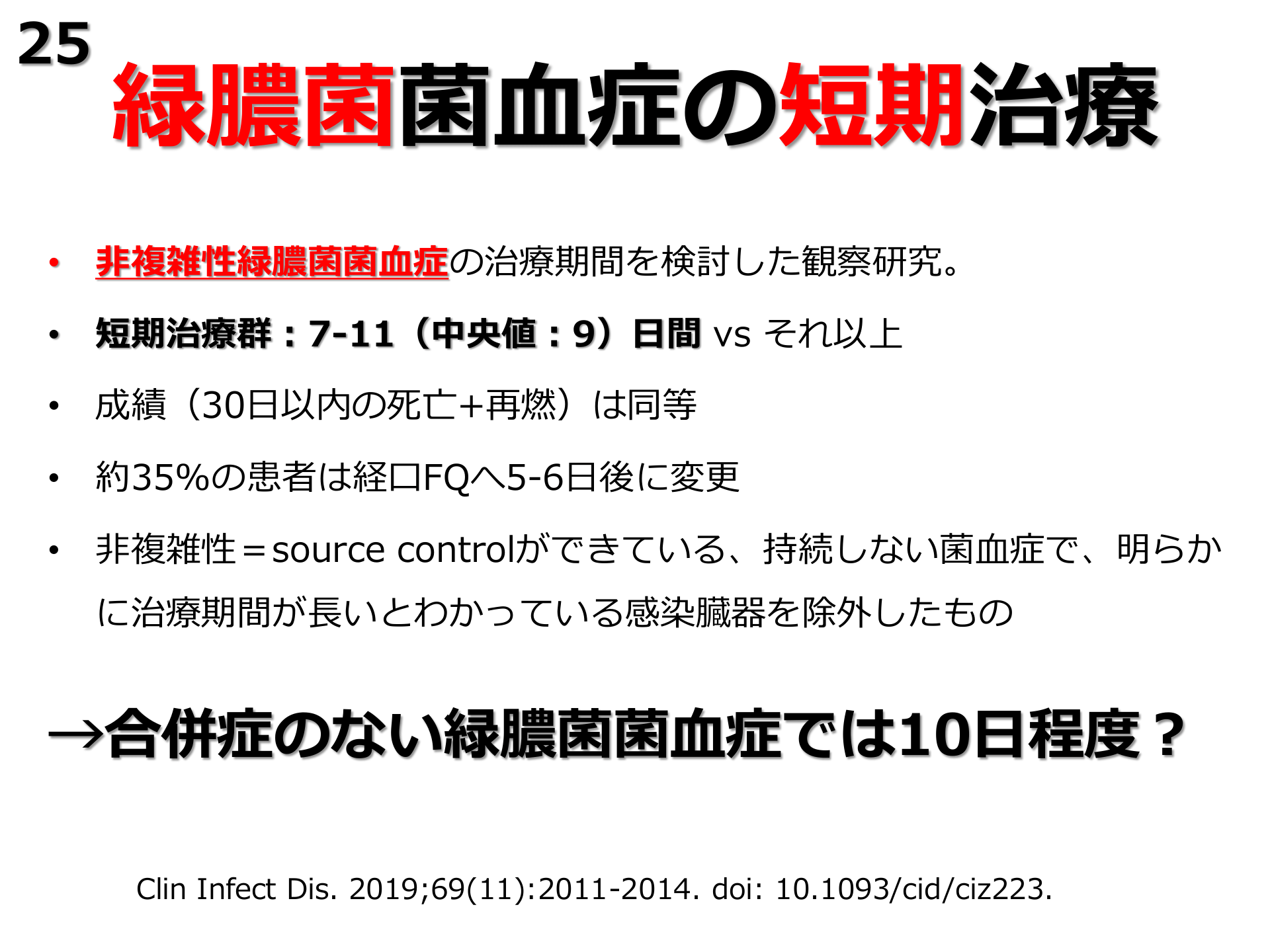 #35. 25 緑膿菌菌血症の短期治療 • 非複雑性緑膿菌菌血症の治療期間を検討した観察研究。 • 短期治療群:7-11(中央値:9)日間 vs それ以上 • 成績(30日以内の死亡+再燃)は同等 • 約35%の患者は経口FQへ5-6日後に変更 • 非複雑性=source controlができている、持続しない菌血症で、明らか に治療期間が長いとわかっている感染臓器を除外したもの →合併症のない緑膿菌菌血症では10日程度? Clin Infect Dis. 2019;69(11):2011-2014. doi: 10.1093/cid/ciz223.