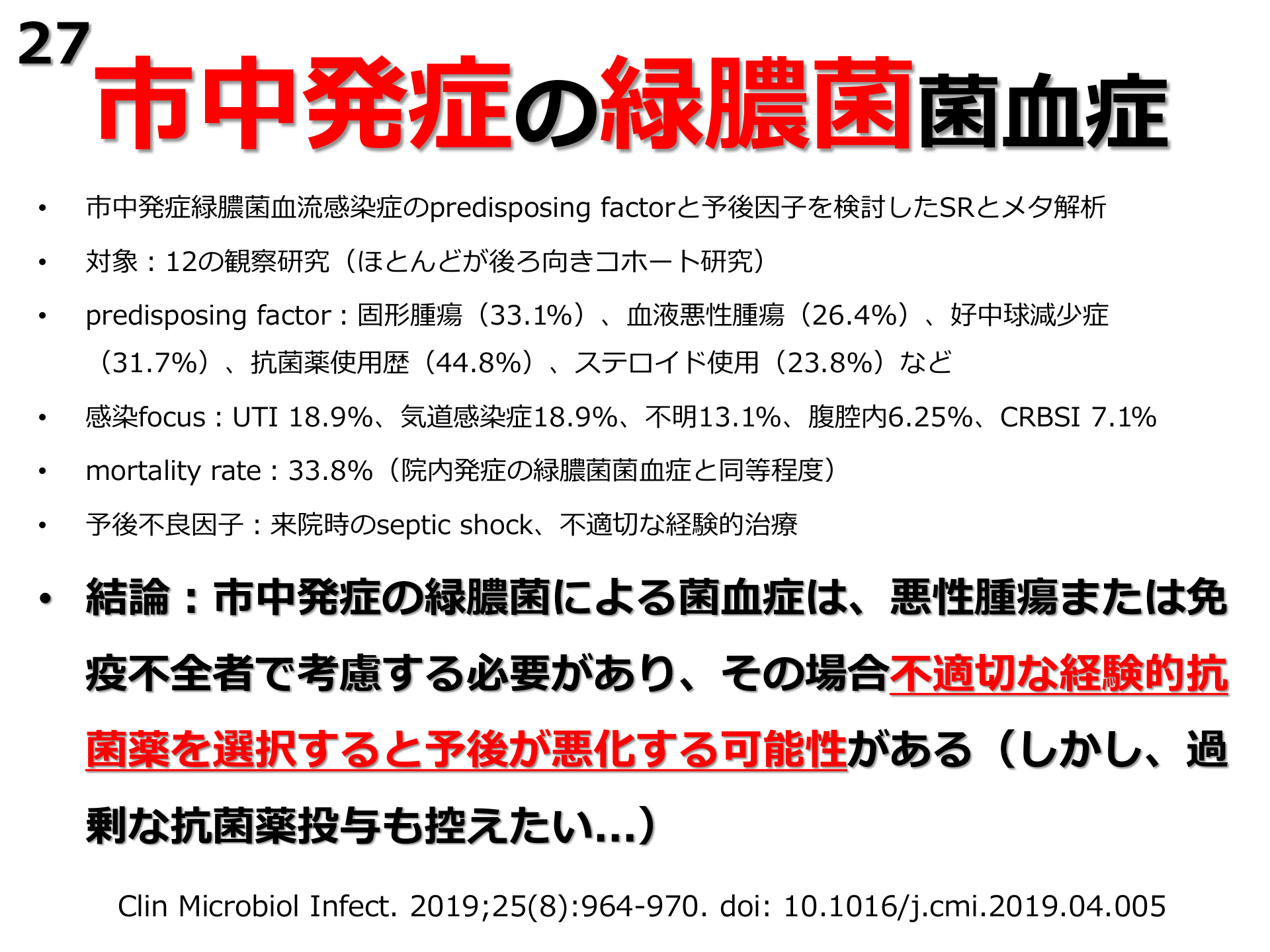 #37. 27 市中発症の緑膿菌菌血症 • 市中発症緑膿菌血流感染症のpredisposing factorと予後因子を検討したSRとメタ解析 • 対象:12の観察研究(ほとんどが後ろ向きコホート研究) • predisposing factor:固形腫瘍(33.1%)、血液悪性腫瘍(26.4%)、好中球減少症 (31.7%)、抗菌薬使用歴(44.8%)、ステロイド使用(23.8%)など • 感染focus:UTI 18.9%、気道感染症18.9%、不明13.1%、腹腔内6.25%、CRBSI 7.1% • mortality rate:33.8%(院内発症の緑膿菌菌血症と同等程度) • 予後不良因子:来院時のseptic shock、不適切な経験的治療 • 結論:市中発症の緑膿菌による菌血症は、悪性腫瘍または免 疫不全者で考慮する必要があり、その場合不適切な経験的抗 菌薬を選択すると予後が悪化する可能性がある(しかし、過 剰な抗菌薬投与も控えたい...) Clin Microbiol Infect. 2019;25(8):964-970. doi: 10.1016/j.cmi.2019.04.005