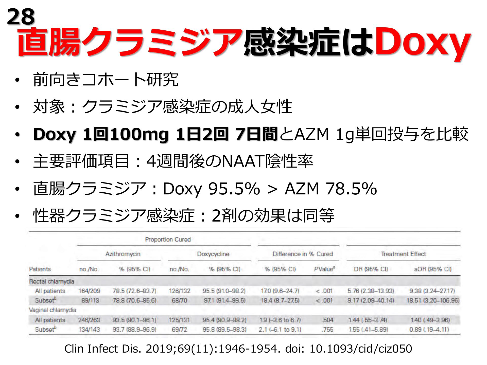 #39. 28 直腸クラミジア感染症はDoxy • 前向きコホート研究 • 対象:クラミジア感染症の成人女性 • Doxy 1回100mg 1日2回 7日間とAZM 1g単回投与を比較 • 主要評価項目:4週間後のNAAT陰性率 • 直腸クラミジア:Doxy 95.5% > AZM 78.5% • 性器クラミジア感染症:2剤の効果は同等 Clin Infect Dis. 2019;69(11):1946-1954. doi: 10.1093/cid/ciz050