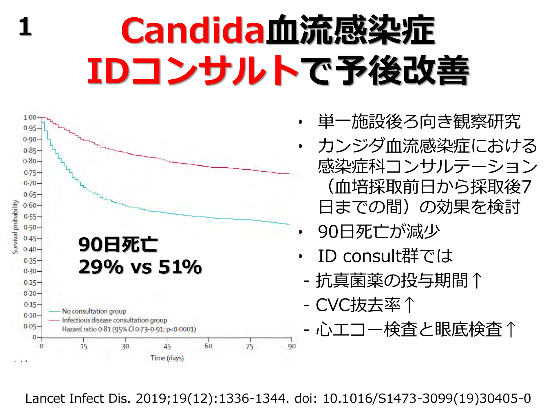 #4. 1 Candida血流感染症 IDコンサルトで予後改善 90日死亡 29% vs 51% • 単一施設後ろ向き観察研究 • カンジダ血流感染症における 感染症科コンサルテーション (血培採取前日から採取後7 日までの間)の効果を検討 • 90日死亡が減少 • ID consult群では - 抗真菌薬の投与期間↑ - CVC抜去率↑ - 心エコー検査と眼底検査↑ Lancet Infect Dis. 2019;19(12):1336-1344. doi: 10.1016/S1473-3099(19)30405-0
