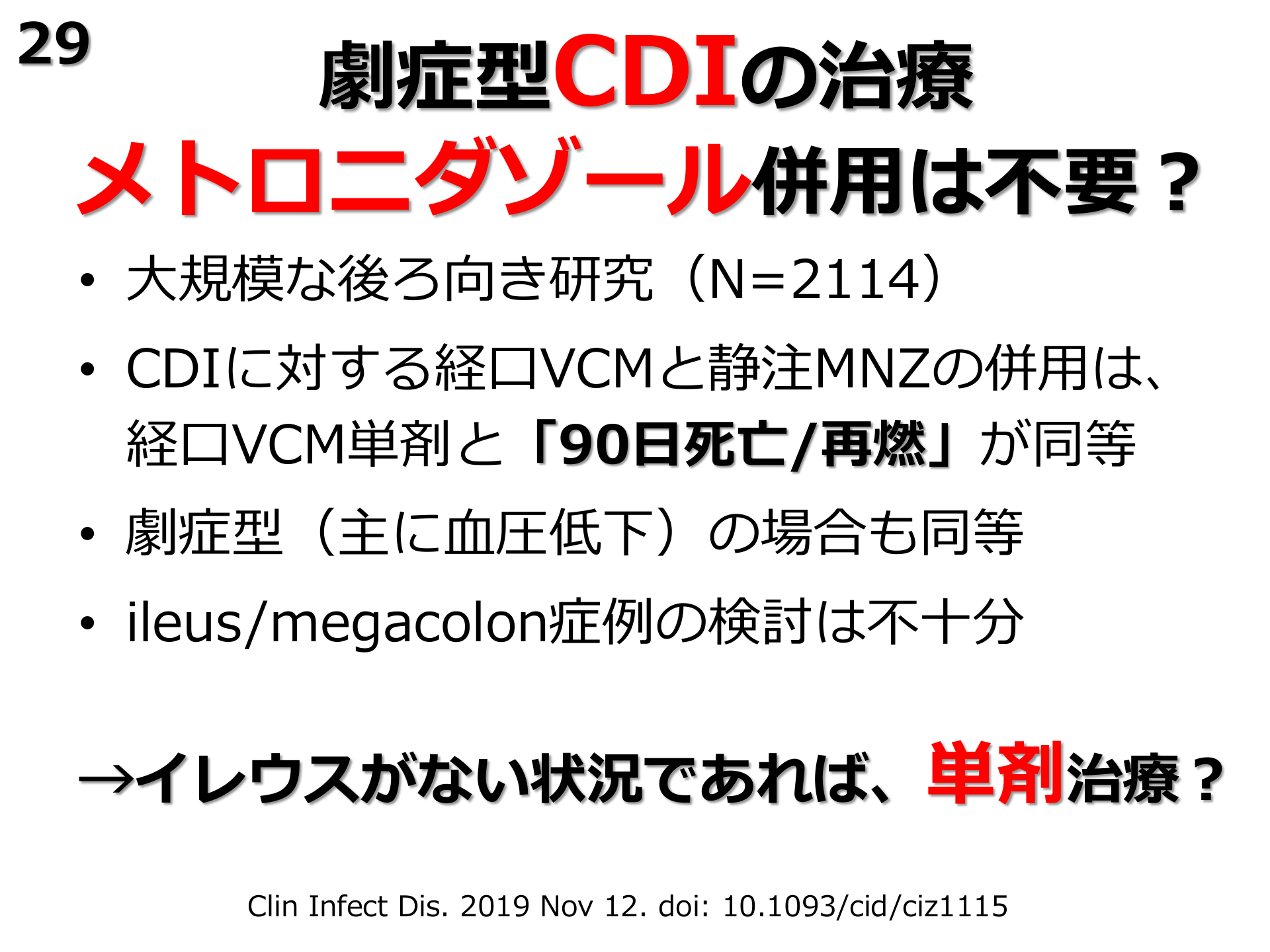 #41. 29 劇症型CDIの治療 メトロニダゾール併用は不要? • 大規模な後ろ向き研究(N=2114) • CDIに対する経口VCMと静注MNZの併用は、 経口VCM単剤と「90日死亡/再燃」が同等 • 劇症型(主に血圧低下)の場合も同等 • ileus/megacolon症例の検討は不十分 →イレウスがない状況であれば、単剤治療? Clin Infect Dis. 2019 Nov 12. doi: 10.1093/cid/ciz1115