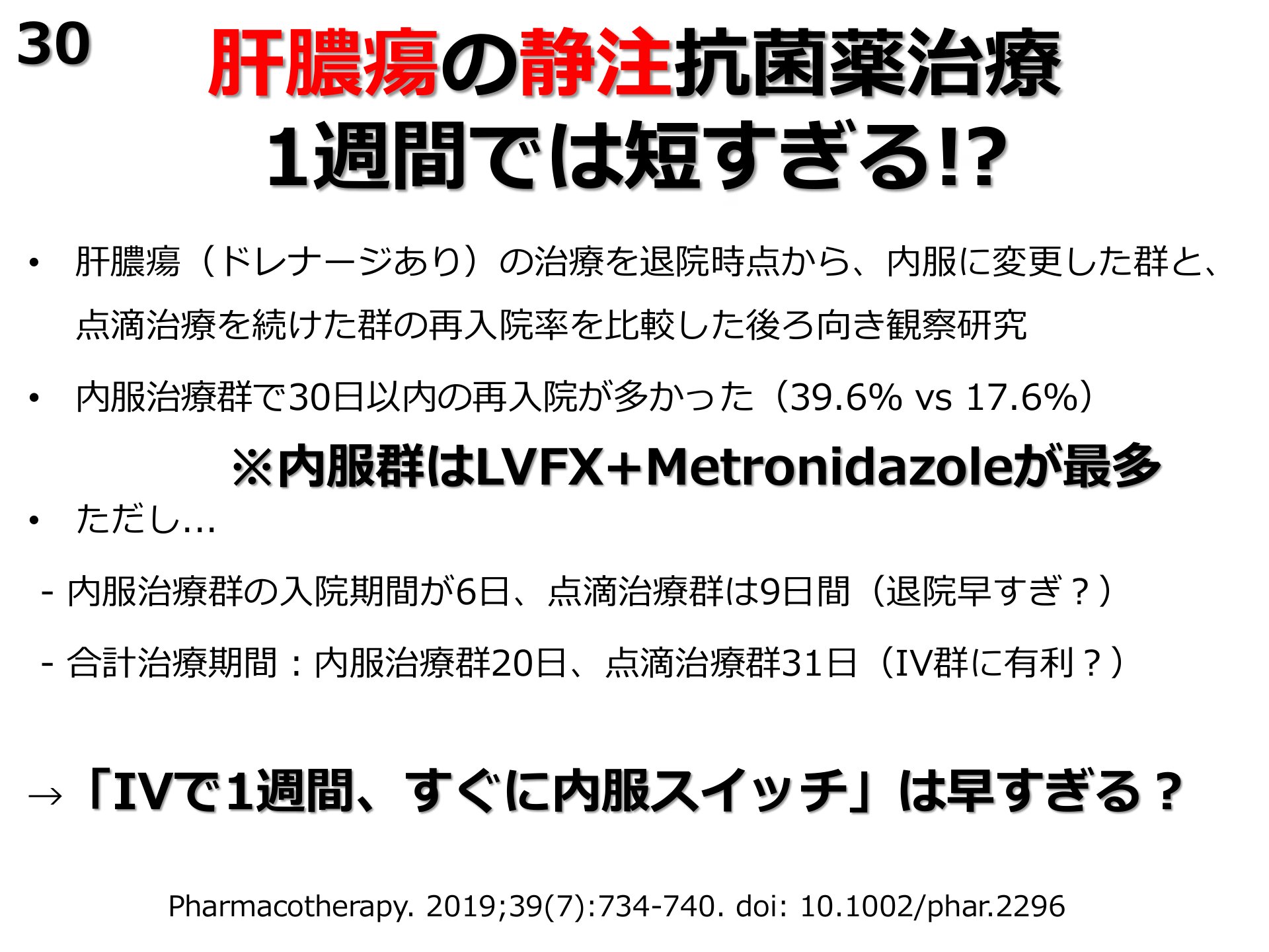 #43. 30 肝膿瘍の静注抗菌薬治療 1週間では短すぎる!? • 肝膿瘍(ドレナージあり)の治療を退院時点から、内服に変更した群と、 点滴治療を続けた群の再入院率を比較した後ろ向き観察研究 • 内服治療群で30日以内の再入院が多かった(39.6% vs 17.6%) ※内服群はLVFX+Metronidazoleが最多 • ただし... - 内服治療群の入院期間が6日、点滴治療群は9日間(退院早すぎ?) - 合計治療期間:内服治療群20日、点滴治療群31日(IV群に有利?) →「IVで1週間、すぐに内服スイッチ」は早すぎる? Pharmacotherapy. 2019;39(7):734-740. doi: 10.1002/phar.2296