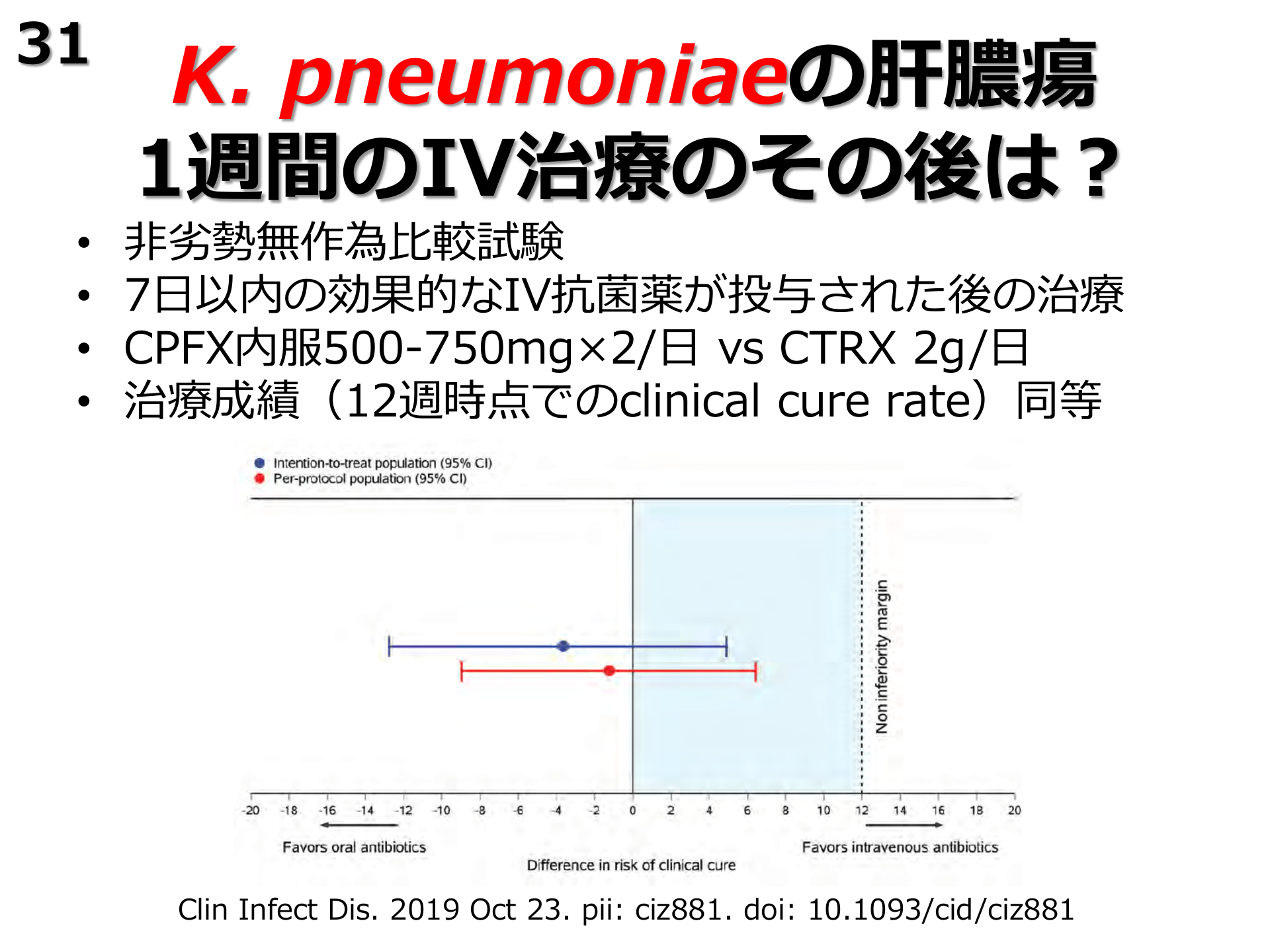 #44. 31 K. pneumoniaeの肝膿瘍 1週間のIV治療のその後は? • • • • 非劣勢無作為比較試験 7日以内の効果的なIV抗菌薬が投与された後の治療 CPFX内服500-750mg×2/日 vs CTRX 2g/日 治療成績(12週時点でのclinical cure rate)同等 Clin Infect Dis. 2019 Oct 23. pii: ciz881. doi: 10.1093/cid/ciz881