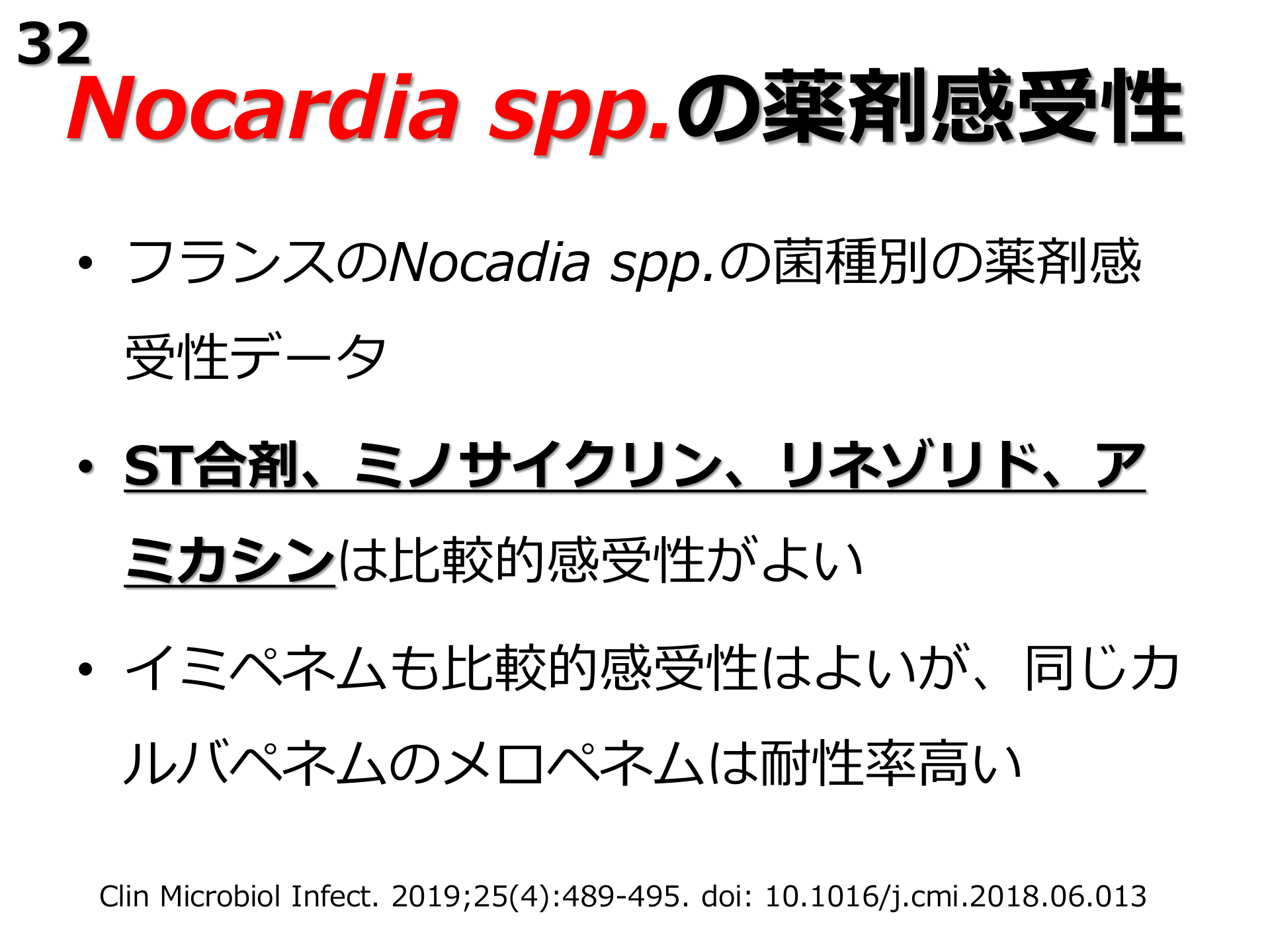#45. 32 Nocardia spp.の薬剤感受性 • フランスのNocadia spp.の菌種別の薬剤感 受性データ • ST合剤、ミノサイクリン、リネゾリド、ア ミカシンは比較的感受性がよい • イミペネムも比較的感受性はよいが、同じカ ルバペネムのメロペネムは耐性率高い Clin Microbiol Infect. 2019;25(4):489-495. doi: 10.1016/j.cmi.2018.06.013