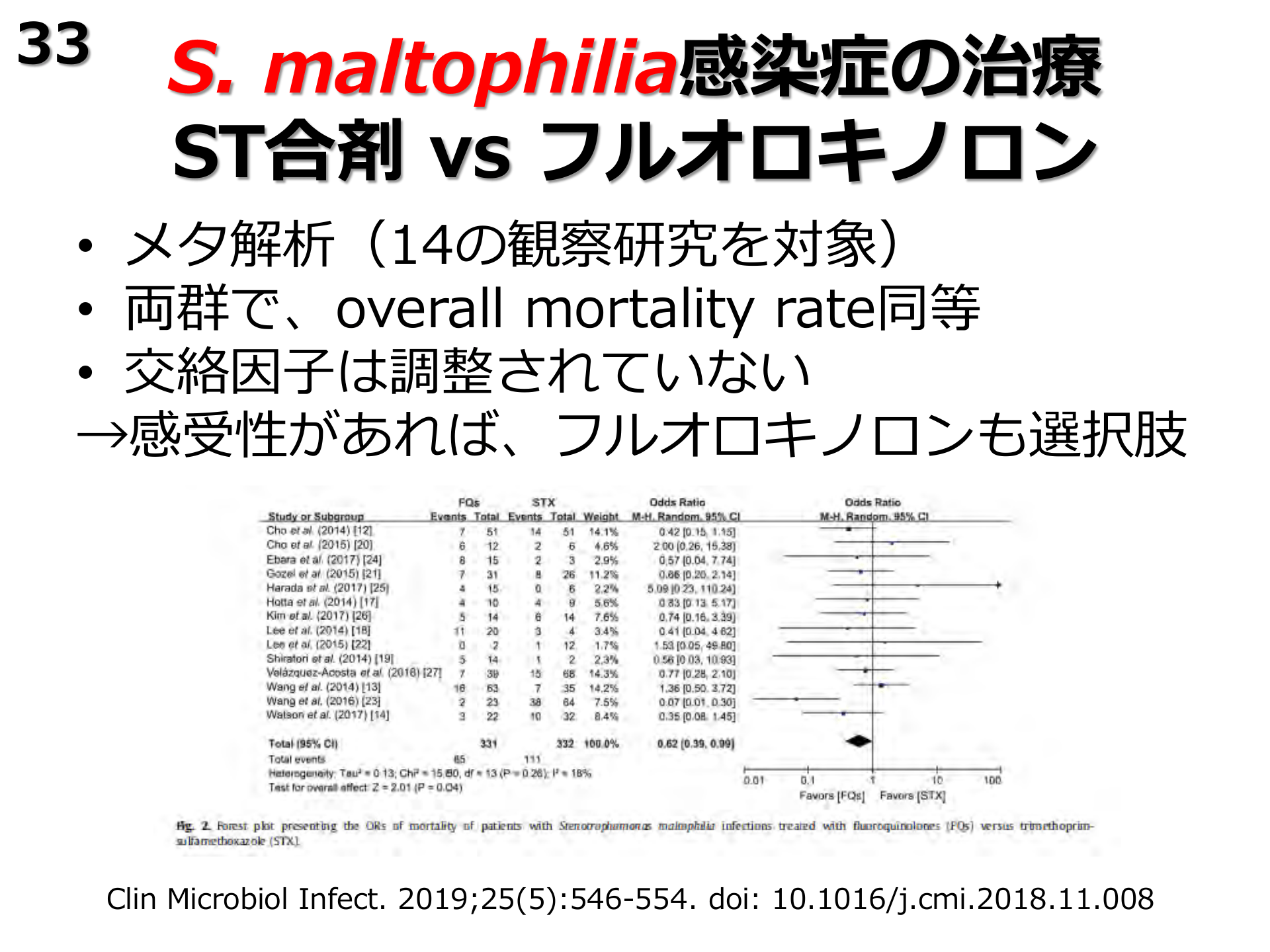 #46. 33 S. maltophilia感染症の治療 ST合剤 vs フルオロキノロン • メタ解析(14の観察研究を対象) • 両群で、overall mortality rate同等 • 交絡因子は調整されていない →感受性があれば、フルオロキノロンも選択肢 Clin Microbiol Infect. 2019;25(5):546-554. doi: 10.1016/j.cmi.2018.11.008