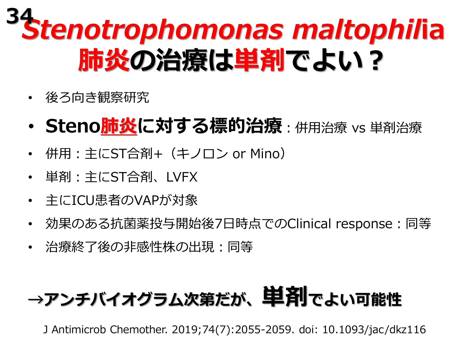 #47. 34 Stenotrophomonas maltophilia 肺炎の治療は単剤でよい? • 後ろ向き観察研究 • Steno肺炎に対する標的治療:併用治療 vs 単剤治療 • 併用:主にST合剤+(キノロン or Mino) • 単剤:主にST合剤、LVFX • 主にICU患者のVAPが対象 • 効果のある抗菌薬投与開始後7日時点でのClinical response:同等 • 治療終了後の非感性株の出現:同等 →アンチバイオグラム次第だが、単剤でよい可能性 J Antimicrob Chemother. 2019;74(7):2055-2059. doi: 10.1093/jac/dkz116