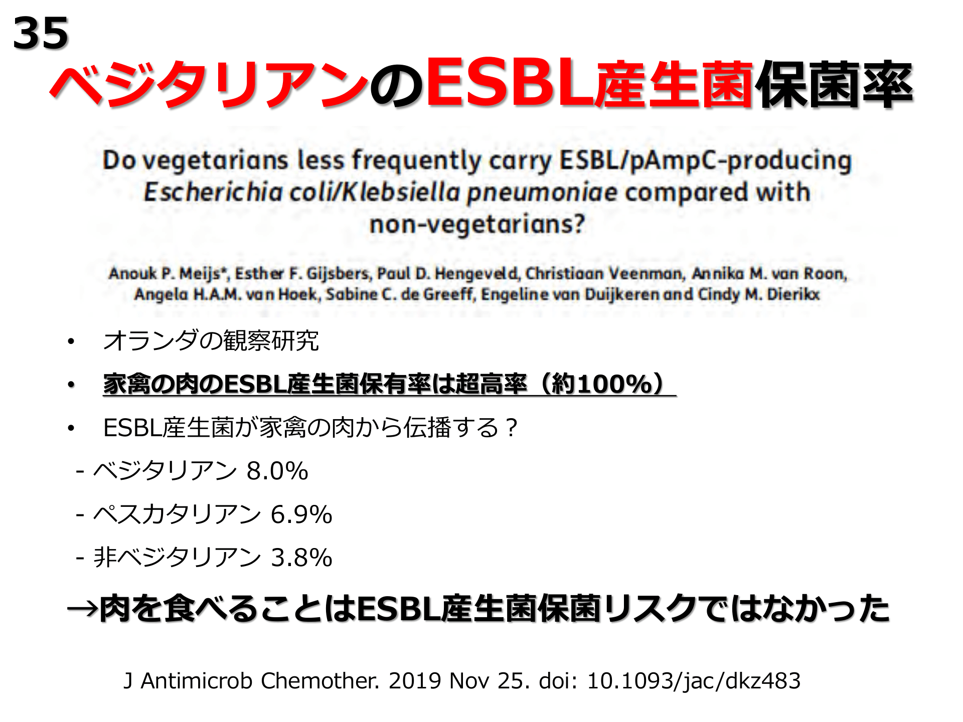 #49. 35 ベジタリアンのESBL産生菌保菌率 • オランダの観察研究 • 家禽の肉のESBL産生菌保有率は超高率(約100%) • ESBL産生菌が家禽の肉から伝播する? - ベジタリアン 8.0% - ペスカタリアン 6.9% - 非ベジタリアン 3.8% →肉を食べることはESBL産生菌保菌リスクではなかった J Antimicrob Chemother. 2019 Nov 25. doi: 10.1093/jac/dkz483
