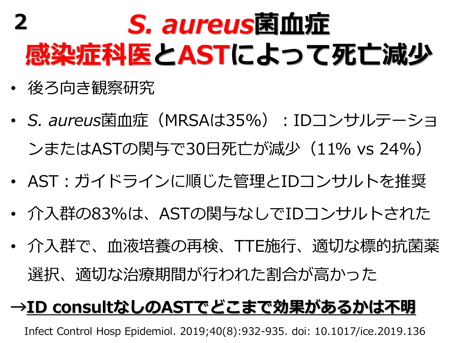 #5. S. aureus菌血症 感染症科医とASTによって死亡減少 2 • 後ろ向き観察研究 • S. aureus菌血症(MRSAは35%):IDコンサルテーショ ンまたはASTの関与で30日死亡が減少(11% vs 24%) • AST:ガイドラインに順じた管理とIDコンサルトを推奨 • 介入群の83%は、ASTの関与なしでIDコンサルトされた • 介入群で、血液培養の再検、TTE施行、適切な標的抗菌薬 選択、適切な治療期間が行われた割合が高かった →ID consultなしのASTでどこまで効果があるかは不明 Infect Control Hosp Epidemiol. 2019;40(8):932-935. doi: 10.1017/ice.2019.136