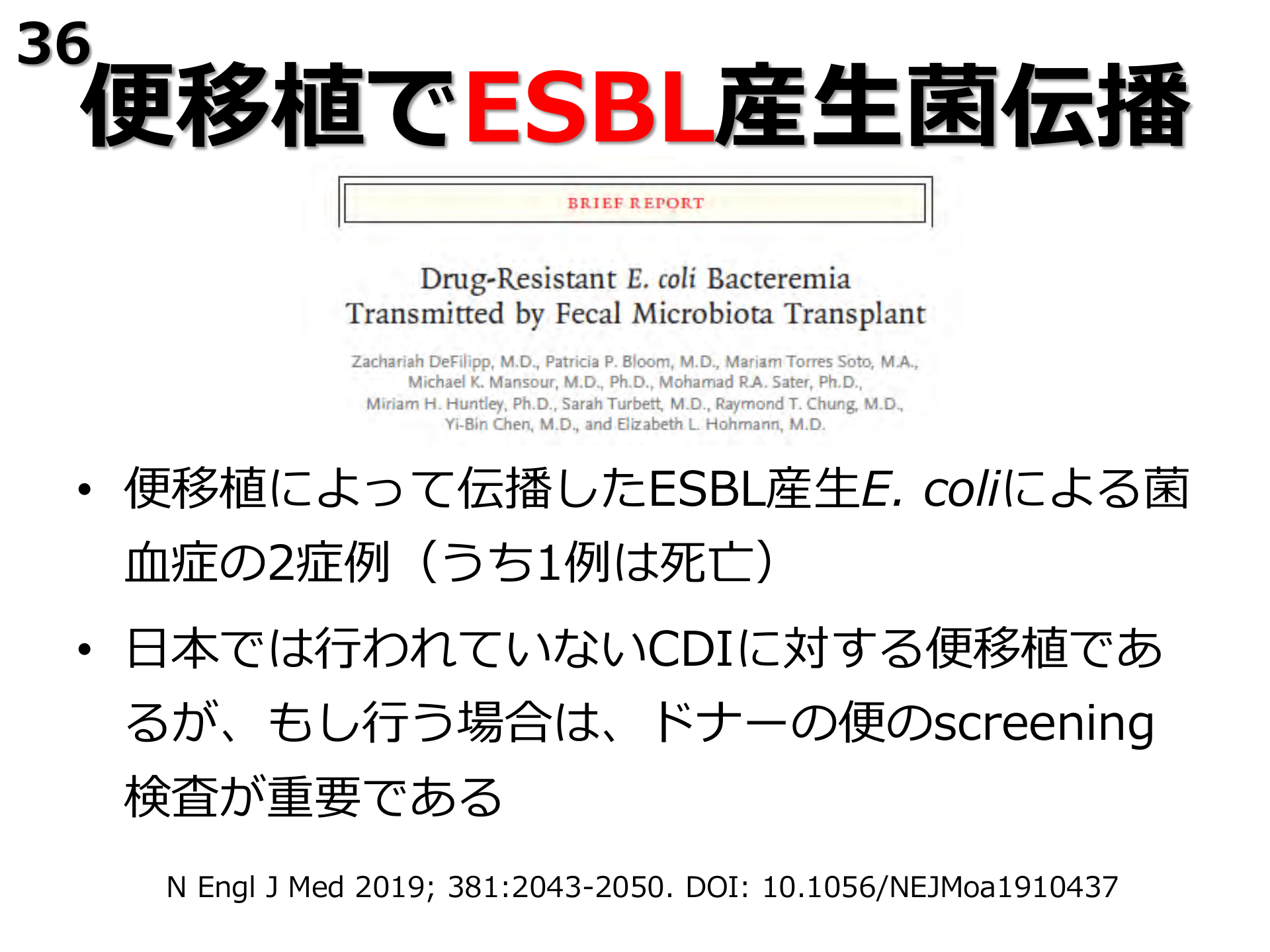 #50. 36 便移植でESBL産生菌伝播 • 便移植によって伝播したESBL産生E. coliによる菌 血症の2症例(うち1例は死亡) • 日本では行われていないCDIに対する便移植であ るが、もし行う場合は、ドナーの便のscreening 検査が重要である N Engl J Med 2019; 381:2043-2050. DOI: 10.1056/NEJMoa1910437