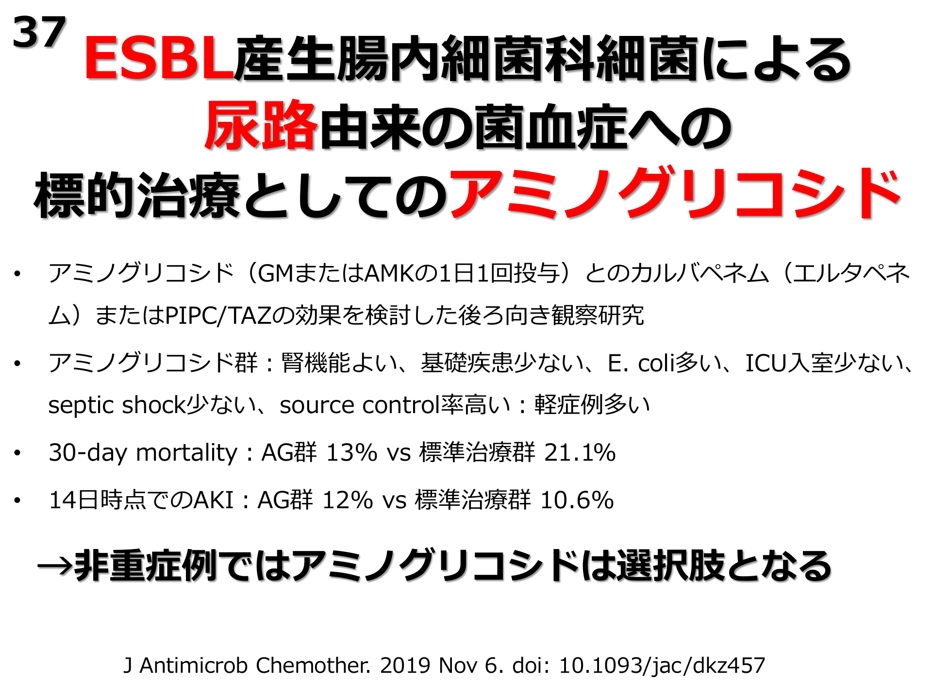 #51. 37 ESBL産生腸内細菌科細菌による 尿路由来の菌血症への 標的治療としてのアミノグリコシド • アミノグリコシド(GMまたはAMKの1日1回投与)とのカルバペネム(エルタペネ ム)またはPIPC/TAZの効果を検討した後ろ向き観察研究 • アミノグリコシド群:腎機能よい、基礎疾患少ない、E. coli多い、ICU入室少ない、 septic shock少ない、source control率高い:軽症例多い • 30-day mortality:AG群 13% vs 標準治療群 21.1% • 14日時点でのAKI:AG群 12% vs 標準治療群 10.6% →非重症例ではアミノグリコシドは選択肢となる J Antimicrob Chemother. 2019 Nov 6. doi: 10.1093/jac/dkz457
