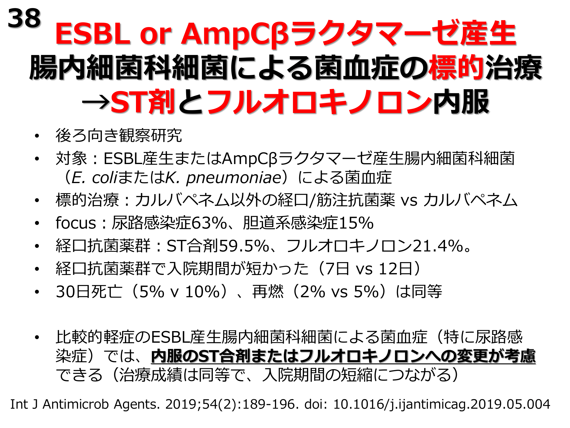 #52. 38 ESBL or AmpCβラクタマーゼ産生 腸内細菌科細菌による菌血症の標的治療 →ST剤とフルオロキノロン内服 • 後ろ向き観察研究 • 対象:ESBL産生またはAmpCβラクタマーゼ産生腸内細菌科細菌 (E. coliまたはK. pneumoniae)による菌血症 • 標的治療:カルバペネム以外の経口/筋注抗菌薬 vs カルバペネム • focus:尿路感染症63%、胆道系感染症15% • 経口抗菌薬群:ST合剤59.5%、フルオロキノロン21.4%。 • 経口抗菌薬群で入院期間が短かった(7日 vs 12日) • 30日死亡(5% v 10%)、再燃(2% vs 5%)は同等 • 比較的軽症のESBL産生腸内細菌科細菌による菌血症(特に尿路感 染症)では、内服のST合剤またはフルオロキノロンへの変更が考慮 できる(治療成績は同等で、入院期間の短縮につながる) Int J Antimicrob Agents. 2019;54(2):189-196. doi: 10.1016/j.ijantimicag.2019.05.004