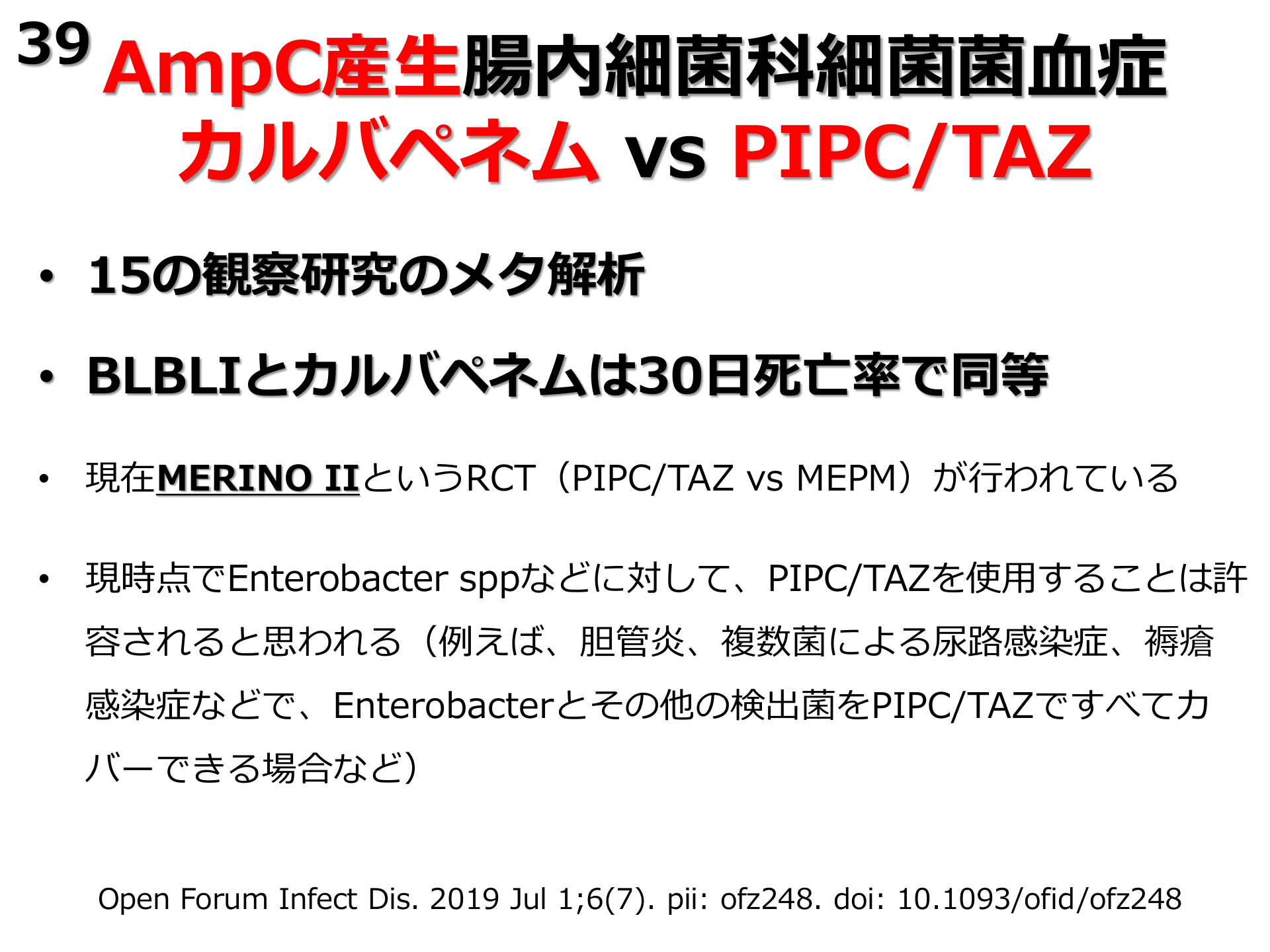 #53. 39 AmpC産生腸内細菌科細菌菌血症 カルバペネム vs PIPC/TAZ • 15の観察研究のメタ解析 • BLBLIとカルバペネムは30日死亡率で同等 • 現在MERINO IIというRCT(PIPC/TAZ vs MEPM)が行われている • 現時点でEnterobacter sppなどに対して、PIPC/TAZを使用することは許 容されると思われる(例えば、胆管炎、複数菌による尿路感染症、褥瘡 感染症などで、Enterobacterとその他の検出菌をPIPC/TAZですべてカ バーできる場合など) Open Forum Infect Dis. 2019 Jul 1;6(7). pii: ofz248. doi: 10.1093/ofid/ofz248