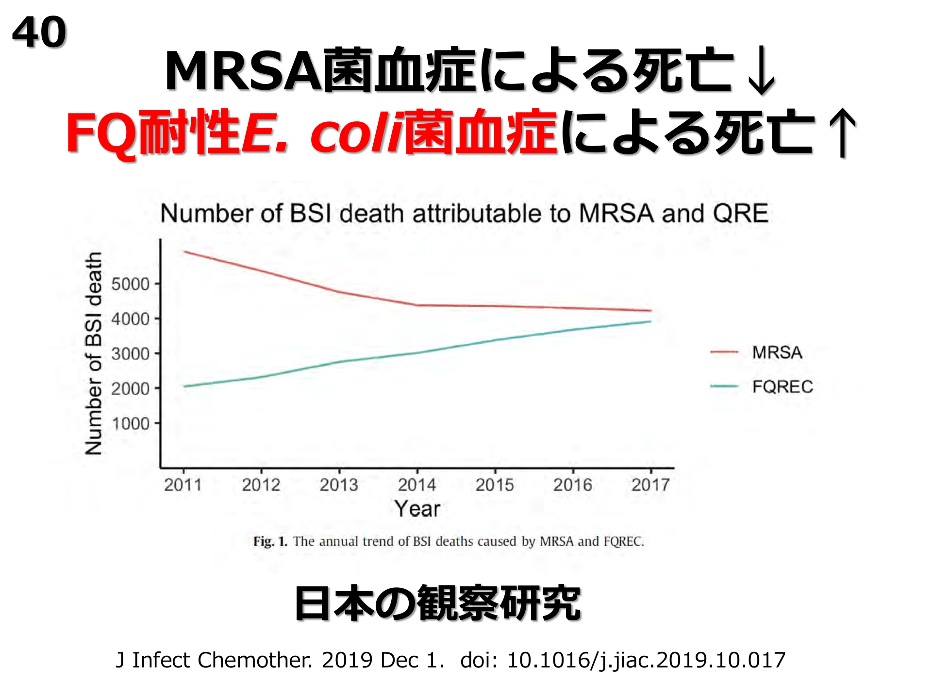 #54. 40 MRSA菌血症による死亡↓ FQ耐性E. coli菌血症による死亡↑ 日本の観察研究 J Infect Chemother. 2019 Dec 1. doi: 10.1016/j.jiac.2019.10.017