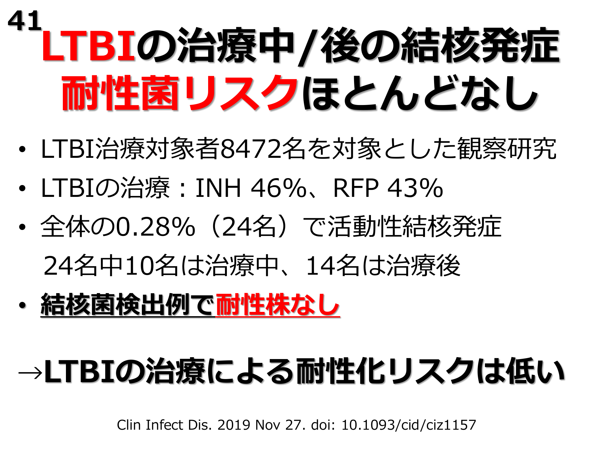 #56. 41 LTBIの治療中/後の結核発症 耐性菌リスクほとんどなし • LTBI治療対象者8472名を対象とした観察研究 • LTBIの治療:INH 46%、RFP 43% • 全体の0.28%(24名)で活動性結核発症 24名中10名は治療中、14名は治療後 • 結核菌検出例で耐性株なし →LTBIの治療による耐性化リスクは低い Clin Infect Dis. 2019 Nov 27. doi: 10.1093/cid/ciz1157