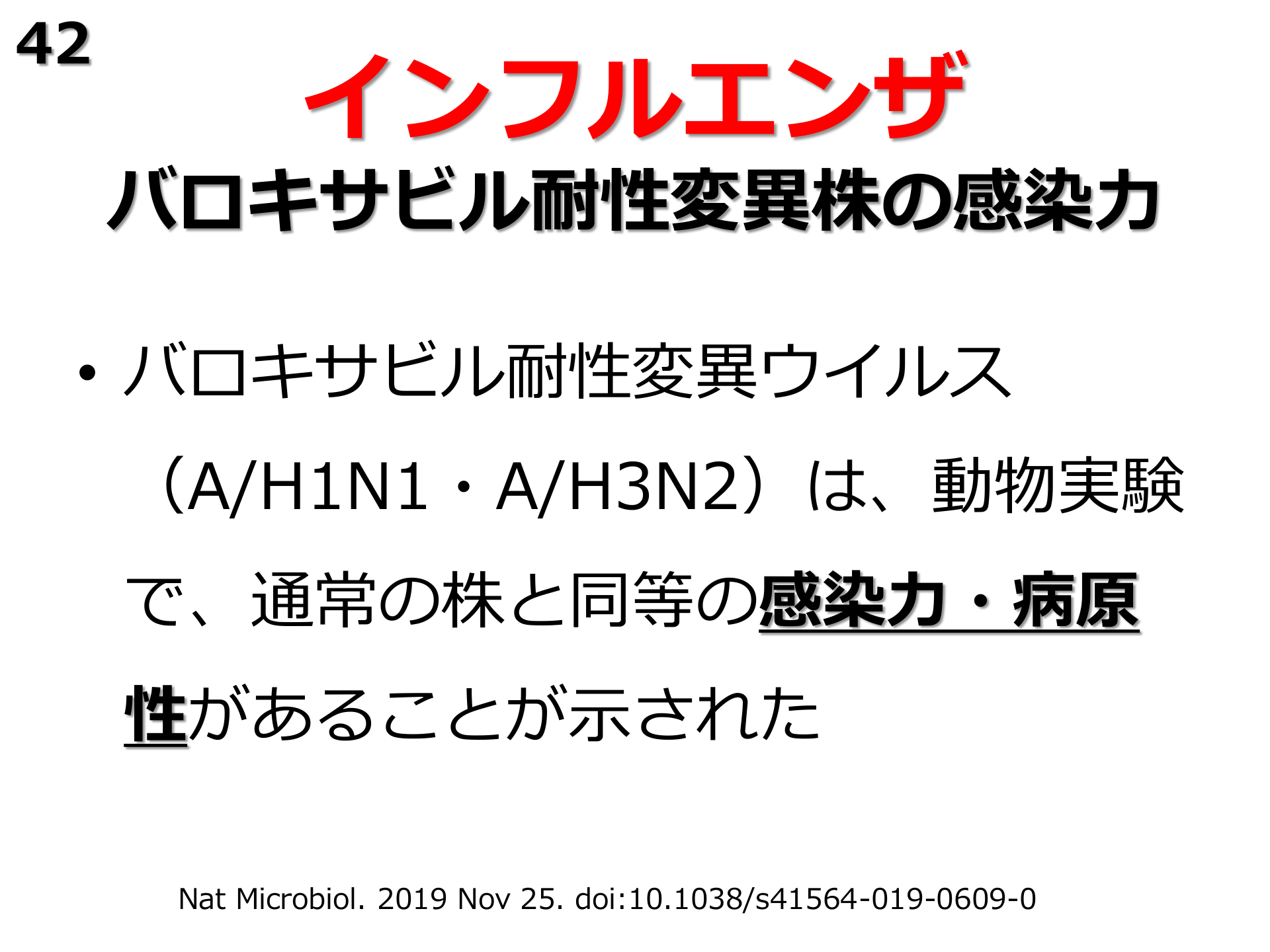#58. 42 インフルエンザ バロキサビル耐性変異株の感染力 • バロキサビル耐性変異ウイルス (A/H1N1・A/H3N2)は、動物実験 で、通常の株と同等の感染力・病原 性があることが示された Nat Microbiol. 2019 Nov 25. doi:10.1038/s41564-019-0609-0