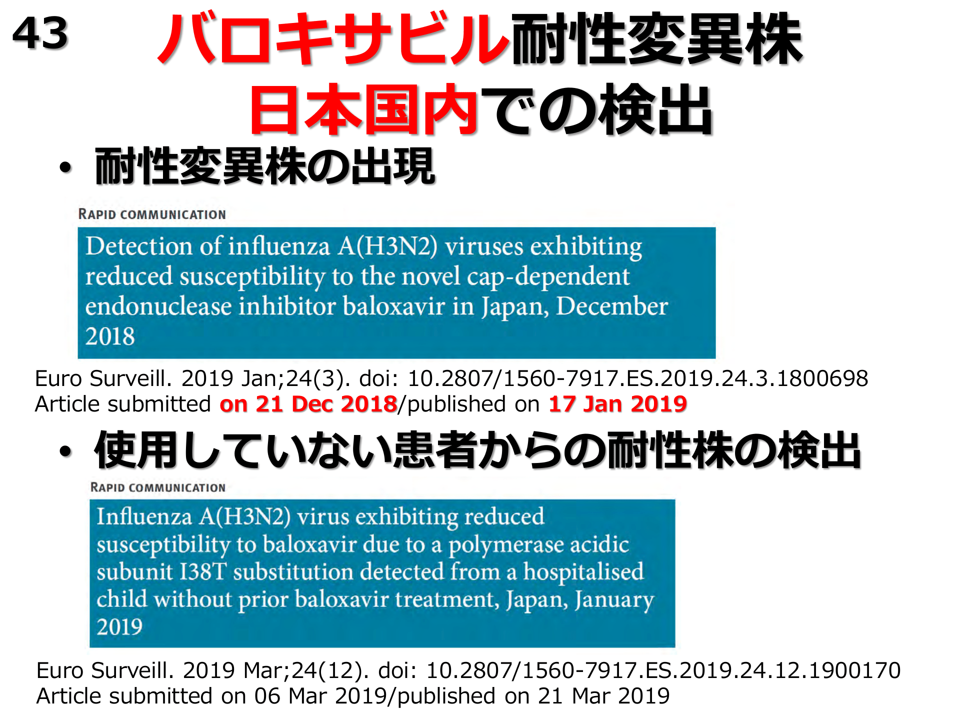 #59. 43 バロキサビル耐性変異株 日本国内での検出 • 耐性変異株の出現 Euro Surveill. 2019 Jan;24(3). doi: 10.2807/1560-7917.ES.2019.24.3.1800698 Article submitted on 21 Dec 2018/published on 17 Jan 2019 • 使用していない患者からの耐性株の検出 Euro Surveill. 2019 Mar;24(12). doi: 10.2807/1560-7917.ES.2019.24.12.1900170 Article submitted on 06 Mar 2019/published on 21 Mar 2019
