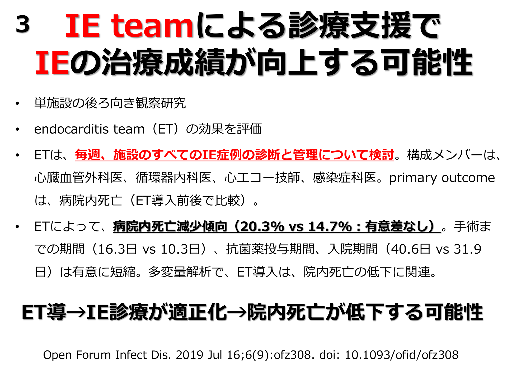 #6. 3 IE teamによる診療支援で IEの治療成績が向上する可能性 • 単施設の後ろ向き観察研究 • endocarditis team(ET)の効果を評価 • ETは、毎週、施設のすべてのIE症例の診断と管理について検討。構成メンバーは、 心臓血管外科医、循環器内科医、心エコー技師、感染症科医。primary outcome は、病院内死亡(ET導入前後で比較)。 • ETによって、病院内死亡減少傾向(20.3% vs 14.7%:有意差なし)。手術ま での期間(16.3日 vs 10.3日)、抗菌薬投与期間、入院期間(40.6日 vs 31.9 日)は有意に短縮。多変量解析で、ET導入は、院内死亡の低下に関連。 ET導→IE診療が適正化→院内死亡が低下する可能性 Open Forum Infect Dis. 2019 Jul 16;6(9):ofz308. doi: 10.1093/ofid/ofz308