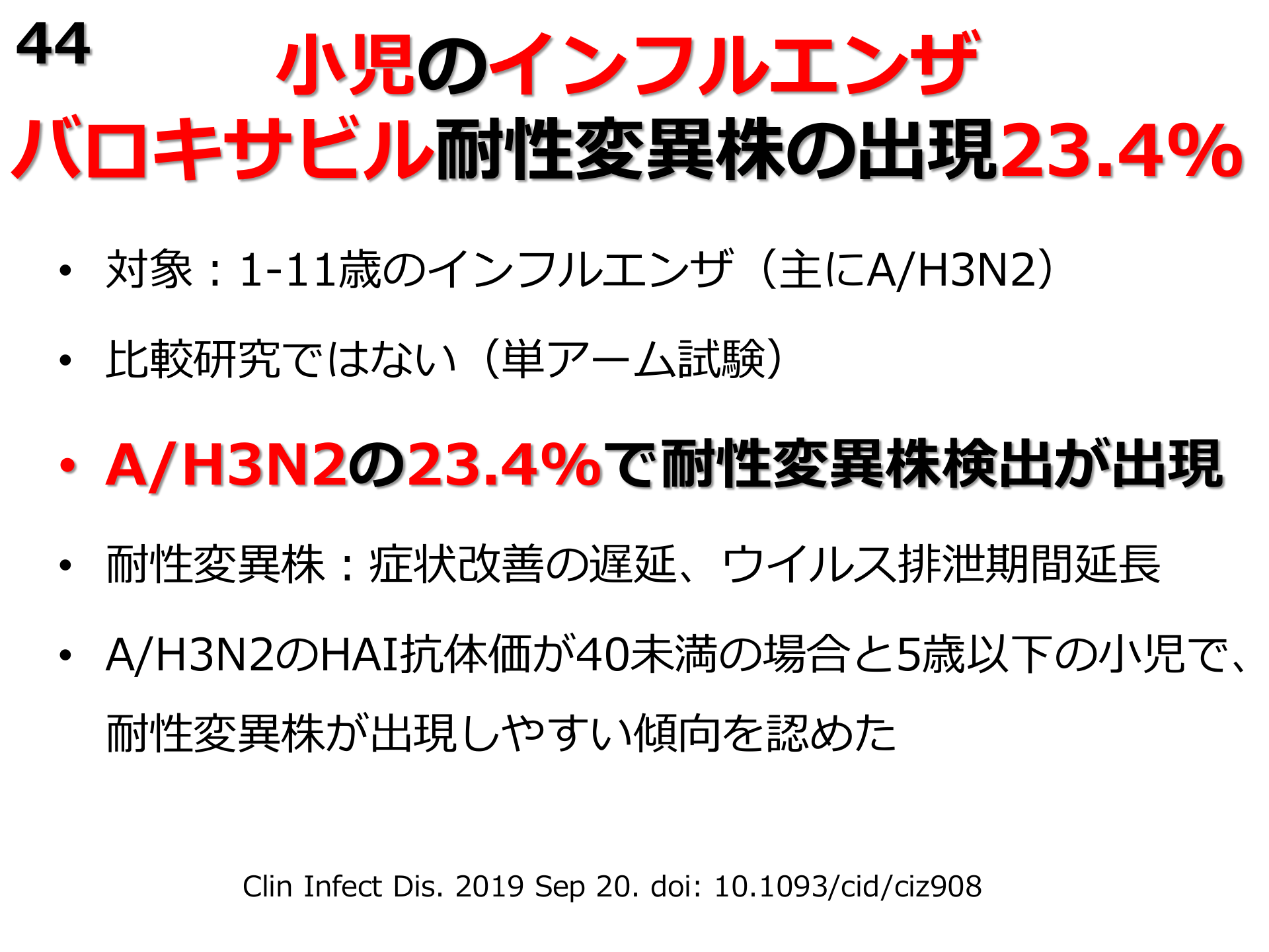 #60. 44 小児のインフルエンザ バロキサビル耐性変異株の出現23.4% • 対象:1-11歳のインフルエンザ(主にA/H3N2) • 比較研究ではない(単アーム試験) • A/H3N2の23.4%で耐性変異株検出が出現 • 耐性変異株:症状改善の遅延、ウイルス排泄期間延長 • A/H3N2のHAI抗体価が40未満の場合と5歳以下の小児で、 耐性変異株が出現しやすい傾向を認めた Clin Infect Dis. 2019 Sep 20. doi: 10.1093/cid/ciz908