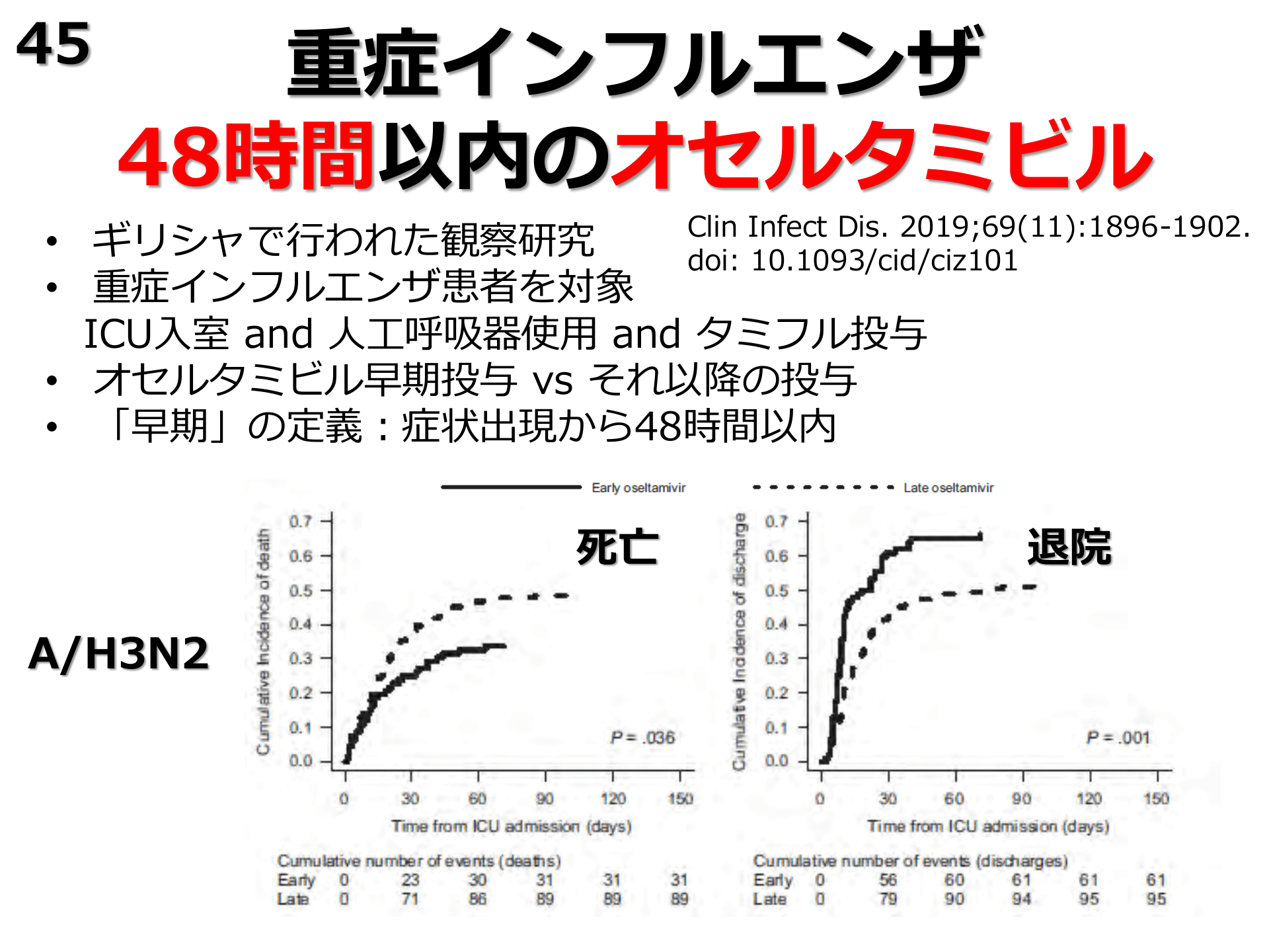 #61. 45 重症インフルエンザ 48時間以内のオセルタミビル Clin Infect Dis. 2019;69(11):1896-1902. • ギリシャで行われた観察研究 doi: 10.1093/cid/ciz101 • 重症インフルエンザ患者を対象 ICU入室 and 人工呼吸器使用 and タミフル投与 • オセルタミビル早期投与 vs それ以降の投与 • 「早期」の定義:症状出現から48時間以内 死亡 A/H3N2 退院