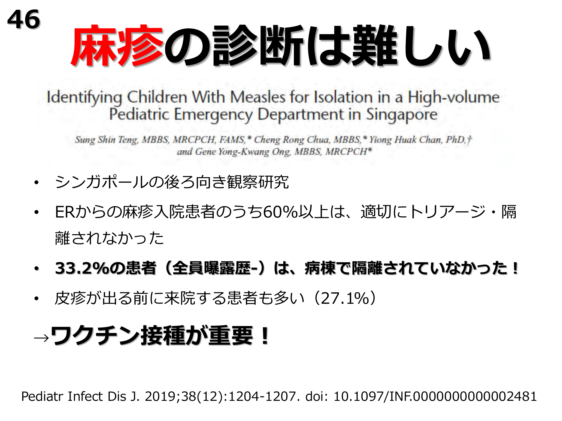 #62. 46 麻疹の診断は難しい • シンガポールの後ろ向き観察研究 • ERからの麻疹入院患者のうち60%以上は、適切にトリアージ・隔 離されなかった • 33.2%の患者(全員曝露歴-)は、病棟で隔離されていなかった! • 皮疹が出る前に来院する患者も多い(27.1%) →ワクチン接種が重要! Pediatr Infect Dis J. 2019;38(12):1204-1207. doi: 10.1097/INF.0000000000002481