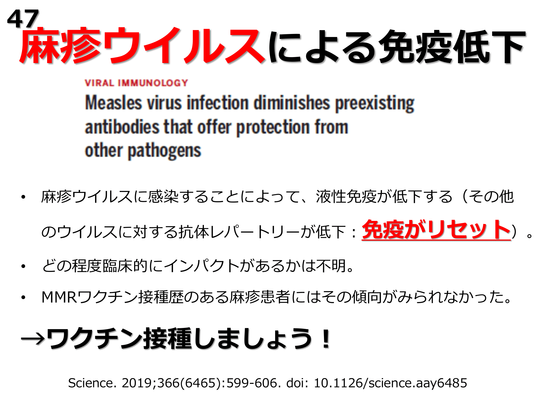 #63. 47 麻疹ウイルスによる免疫低下 • 麻疹ウイルスに感染することによって、液性免疫が低下する(その他 のウイルスに対する抗体レパートリーが低下:免疫がリセット)。 • どの程度臨床的にインパクトがあるかは不明。 • MMRワクチン接種歴のある麻疹患者にはその傾向がみられなかった。 →ワクチン接種しましょう! Science. 2019;366(6465):599-606. doi: 10.1126/science.aay6485
