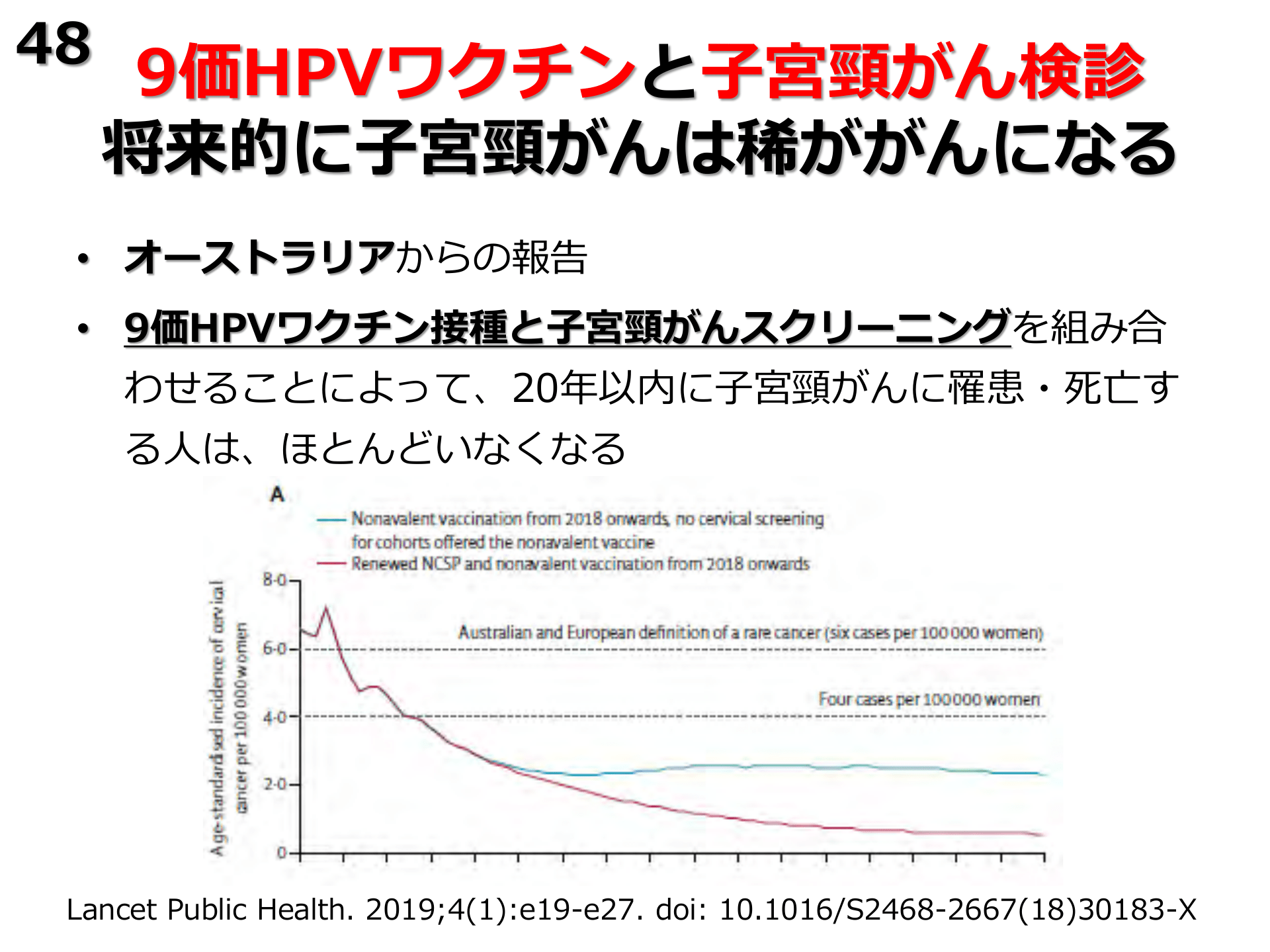 #64. 48 9価HPVワクチンと子宮頸がん検診 将来的に子宮頸がんは稀ががんになる • オーストラリアからの報告 • 9価HPVワクチン接種と子宮頸がんスクリーニングを組み合 わせることによって、20年以内に子宮頸がんに罹患・死亡す る人は、ほとんどいなくなる Lancet Public Health. 2019;4(1):e19-e27. doi: 10.1016/S2468-2667(18)30183-X