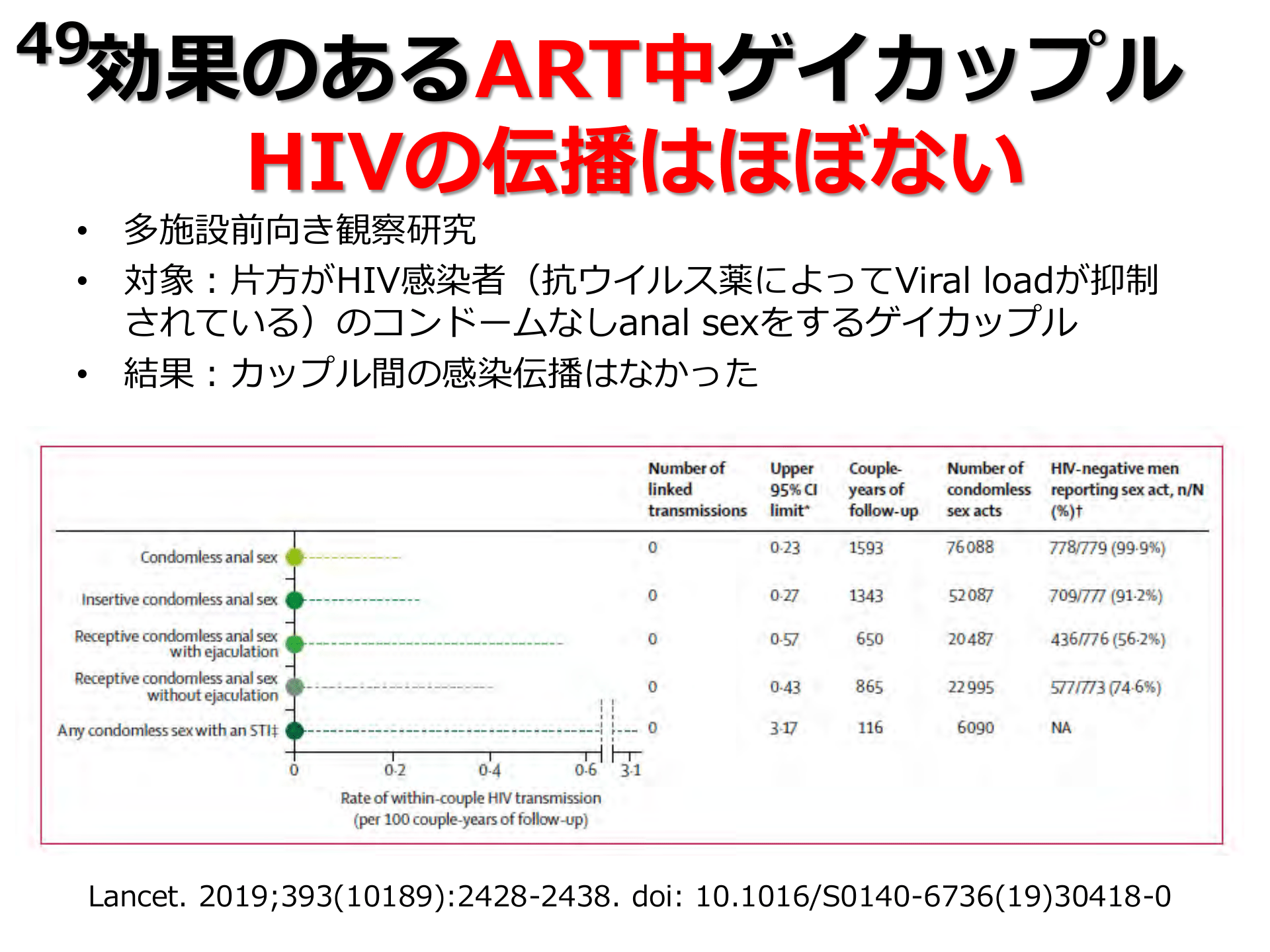 #65. 49 効果のあるART中ゲイカップル HIVの伝播はほぼない • 多施設前向き観察研究 • 対象:片方がHIV感染者(抗ウイルス薬によってViral loadが抑制 されている)のコンドームなしanal sexをするゲイカップル • 結果:カップル間の感染伝播はなかった Lancet. 2019;393(10189):2428-2438. doi: 10.1016/S0140-6736(19)30418-0
