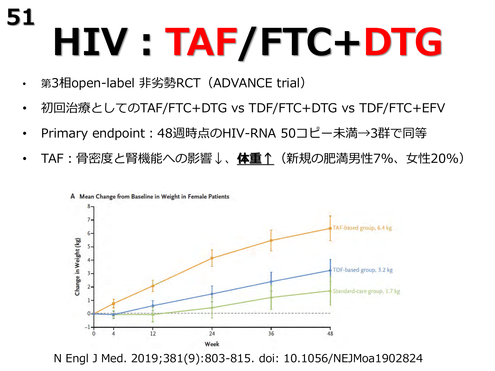 #67. 51 HIV:TAF/FTC+DTG • 第3相open-label 非劣勢RCT(ADVANCE trial) • 初回治療としてのTAF/FTC+DTG vs TDF/FTC+DTG vs TDF/FTC+EFV • Primary endpoint:48週時点のHIV-RNA 50コピー未満→3群で同等 • TAF:骨密度と腎機能への影響↓、体重↑(新規の肥満男性7%、女性20%) N Engl J Med. 2019;381(9):803-815. doi: 10.1056/NEJMoa1902824