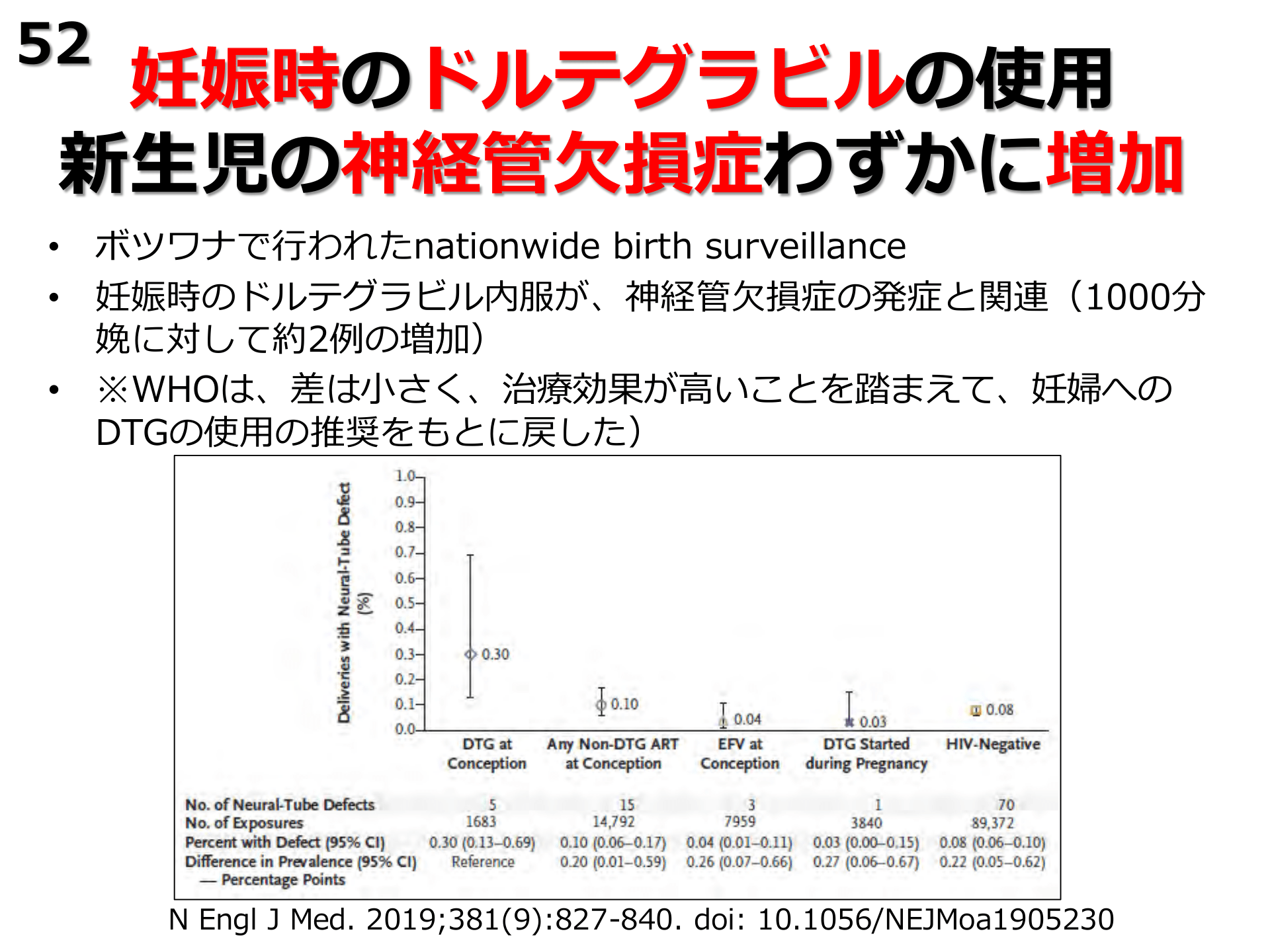 #68. 52 妊娠時のドルテグラビルの使用 新生児の神経管欠損症わずかに増加 • ボツワナで行われたnationwide birth surveillance • 妊娠時のドルテグラビル内服が、神経管欠損症の発症と関連(1000分 娩に対して約2例の増加) • ※WHOは、差は小さく、治療効果が高いことを踏まえて、妊婦への DTGの使用の推奨をもとに戻した) N Engl J Med. 2019;381(9):827-840. doi: 10.1056/NEJMoa1905230