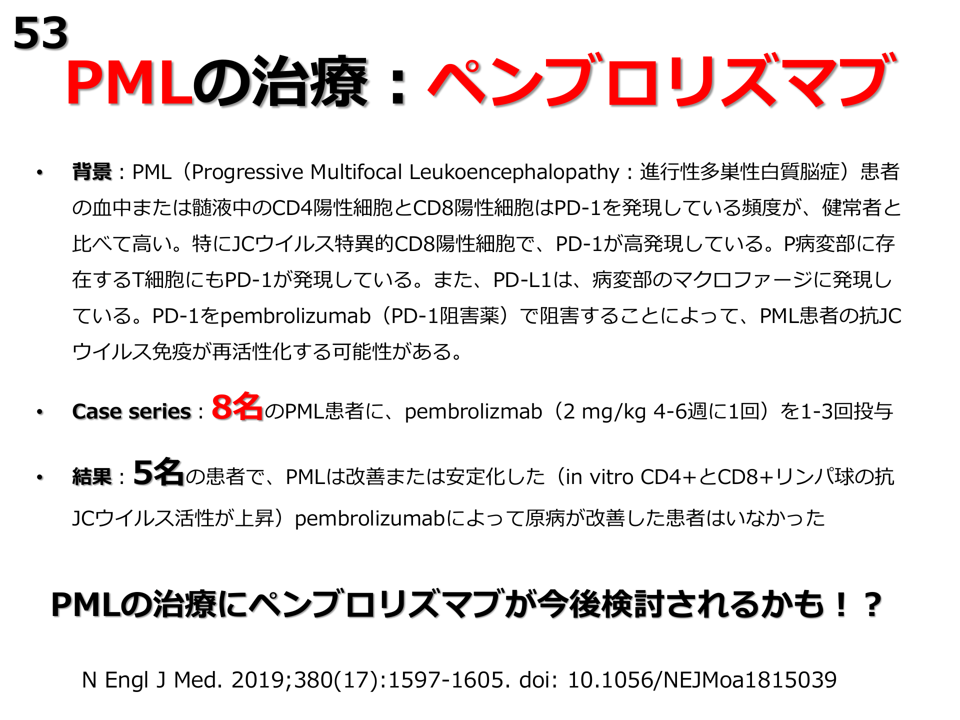 #69. 53 PMLの治療:ペンブロリズマブ • 背景:PML(Progressive Multifocal Leukoencephalopathy:進行性多巣性白質脳症)患者 の血中または髄液中のCD4陽性細胞とCD8陽性細胞はPD-1を発現している頻度が、健常者と 比べて高い。特にJCウイルス特異的CD8陽性細胞で、PD-1が高発現している。P病変部に存 在するT細胞にもPD-1が発現している。また、PD-L1は、病変部のマクロファージに発現し ている。PD-1をpembrolizumab(PD-1阻害薬)で阻害することによって、PML患者の抗JC ウイルス免疫が再活性化する可能性がある。 8名のPML患者に、pembrolizmab(2 mg/kg 4-6週に1回)を1-3回投与 • Case series: • 結果: 5名の患者で、PMLは改善または安定化した(in vitro CD4+とCD8+リンパ球の抗 JCウイルス活性が上昇)pembrolizumabによって原病が改善した患者はいなかった PMLの治療にペンブロリズマブが今後検討されるかも!? N Engl J Med. 2019;380(17):1597-1605. doi: 10.1056/NEJMoa1815039