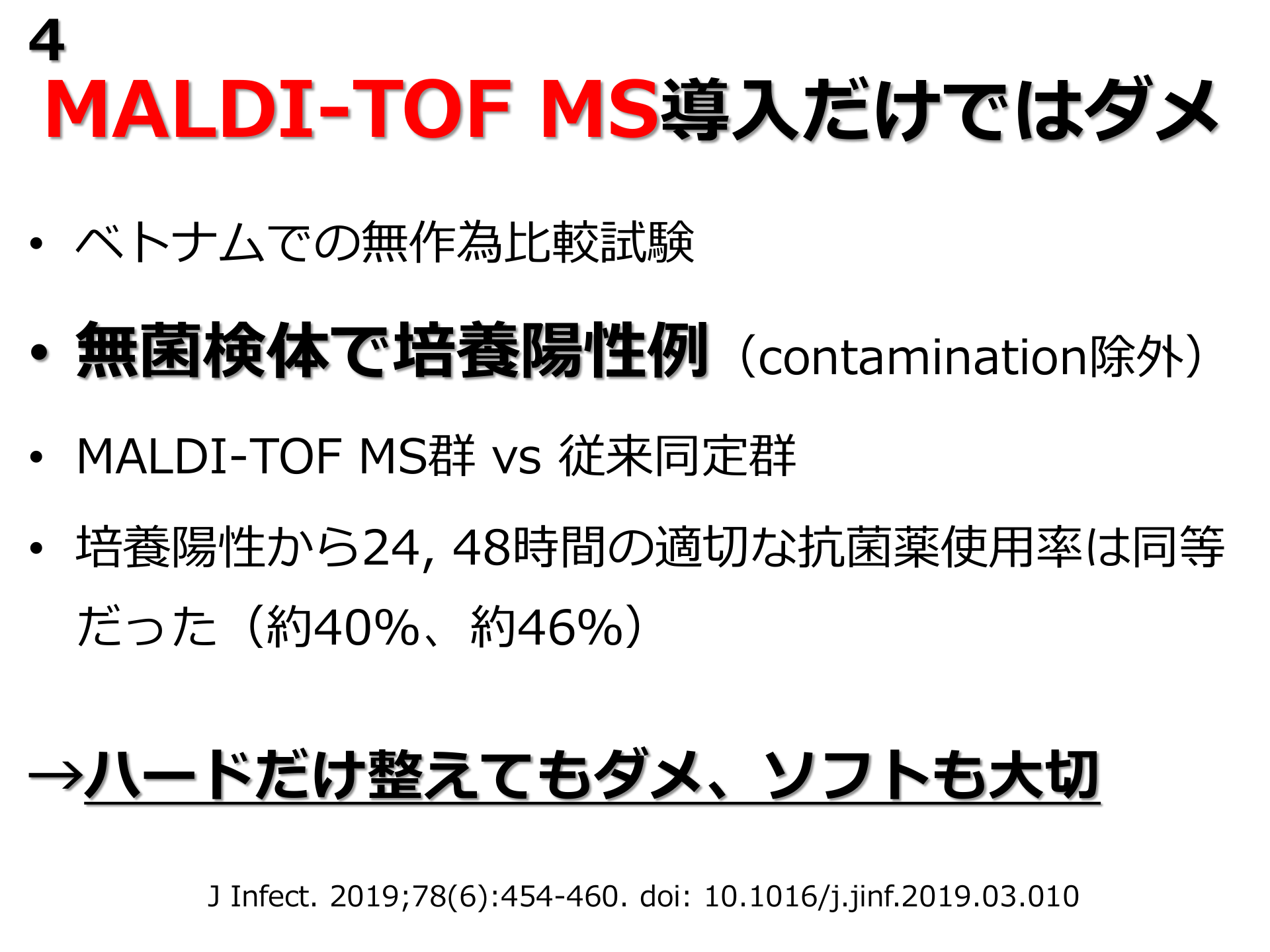 #7. 4 MALDI-TOF MS導入だけではダメ • ベトナムでの無作為比較試験 • 無菌検体で培養陽性例(contamination除外) • MALDI-TOF MS群 vs 従来同定群 • 培養陽性から24, 48時間の適切な抗菌薬使用率は同等 だった(約40%、約46%) →ハードだけ整えてもダメ、ソフトも大切 J Infect. 2019;78(6):454-460. doi: 10.1016/j.jinf.2019.03.010