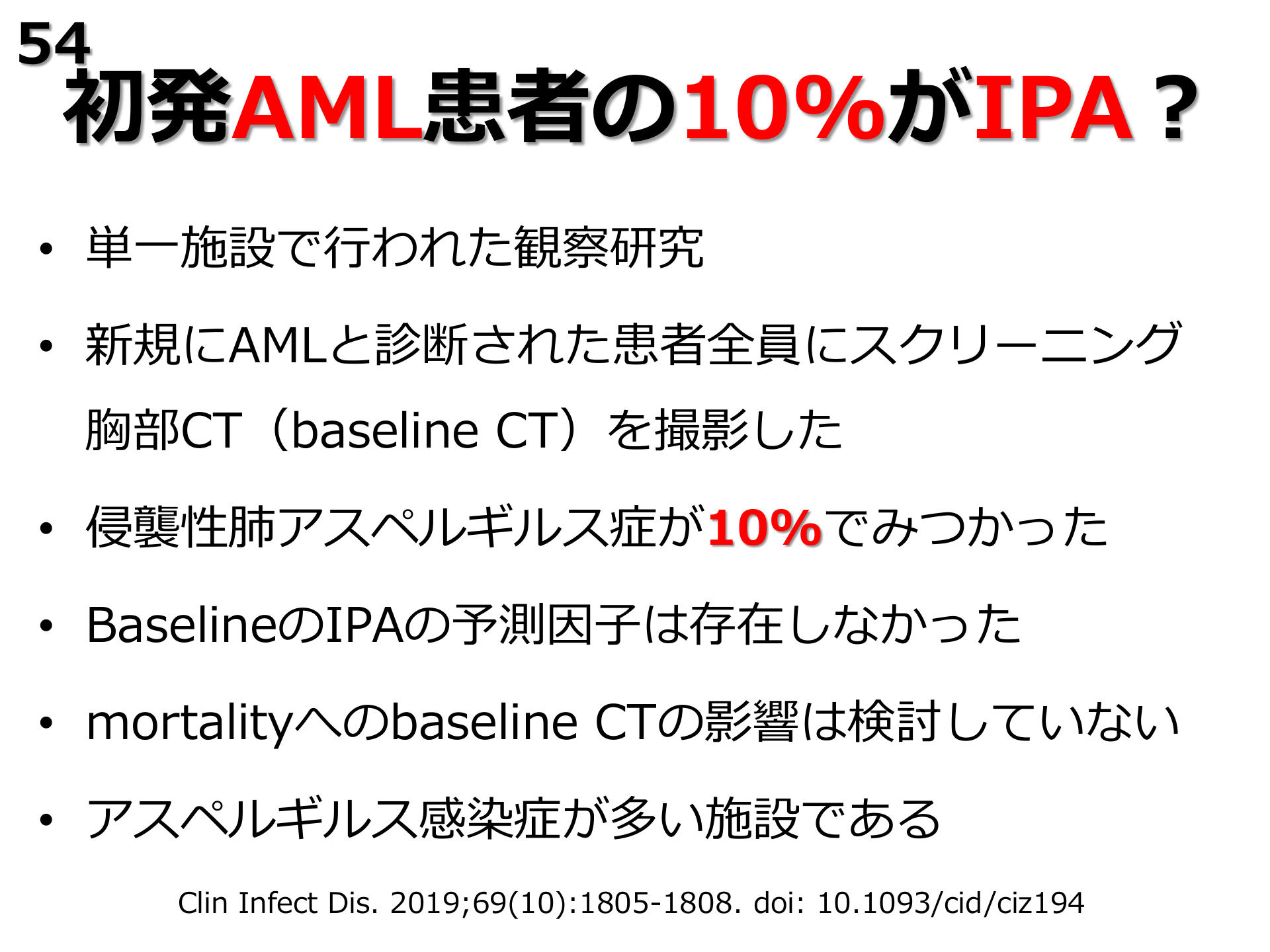 #71. 54 初発AML患者の10%がIPA? • 単一施設で行われた観察研究 • 新規にAMLと診断された患者全員にスクリーニング 胸部CT(baseline CT)を撮影した • 侵襲性肺アスペルギルス症が10%でみつかった • BaselineのIPAの予測因子は存在しなかった • mortalityへのbaseline CTの影響は検討していない • アスペルギルス感染症が多い施設である Clin Infect Dis. 2019;69(10):1805-1808. doi: 10.1093/cid/ciz194