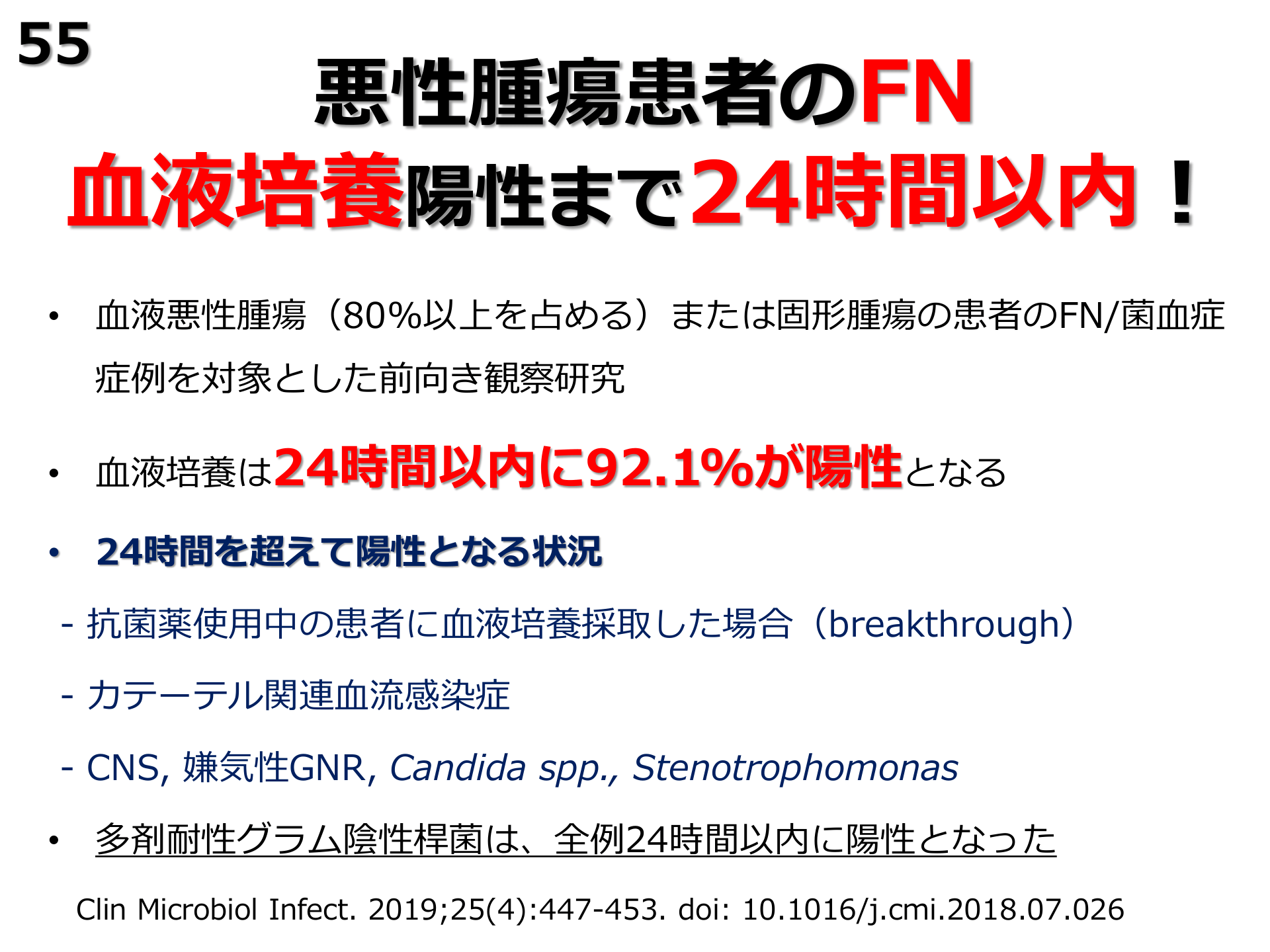 #73. 55 悪性腫瘍患者のFN 血液培養陽性まで24時間以内! • 血液悪性腫瘍(80%以上を占める)または固形腫瘍の患者のFN/菌血症 症例を対象とした前向き観察研究 • 血液培養は24時間以内に92.1%が陽性となる • 24時間を超えて陽性となる状況 - 抗菌薬使用中の患者に血液培養採取した場合(breakthrough) - カテーテル関連血流感染症 - CNS, 嫌気性GNR, Candida spp., Stenotrophomonas • 多剤耐性グラム陰性桿菌は、全例24時間以内に陽性となった Clin Microbiol Infect. 2019;25(4):447-453. doi: 10.1016/j.cmi.2018.07.026