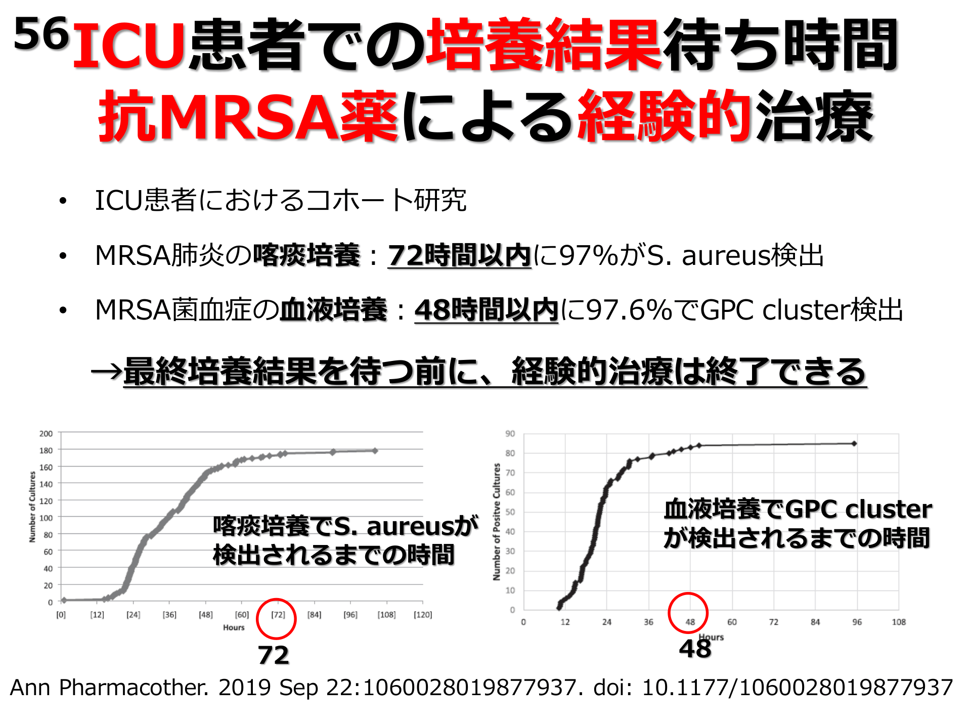 #74. 56ICU患者での培養結果待ち時間 抗MRSA薬による経験的治療 • ICU患者におけるコホート研究 • MRSA肺炎の喀痰培養:72時間以内に97%がS. aureus検出 • MRSA菌血症の血液培養:48時間以内に97.6%でGPC cluster検出 →最終培養結果を待つ前に、経験的治療は終了できる 喀痰培養でS. aureusが 検出されるまでの時間 72 血液培養でGPC cluster が検出されるまでの時間 48 Ann Pharmacother. 2019 Sep 22:1060028019877937. doi: 10.1177/1060028019877937