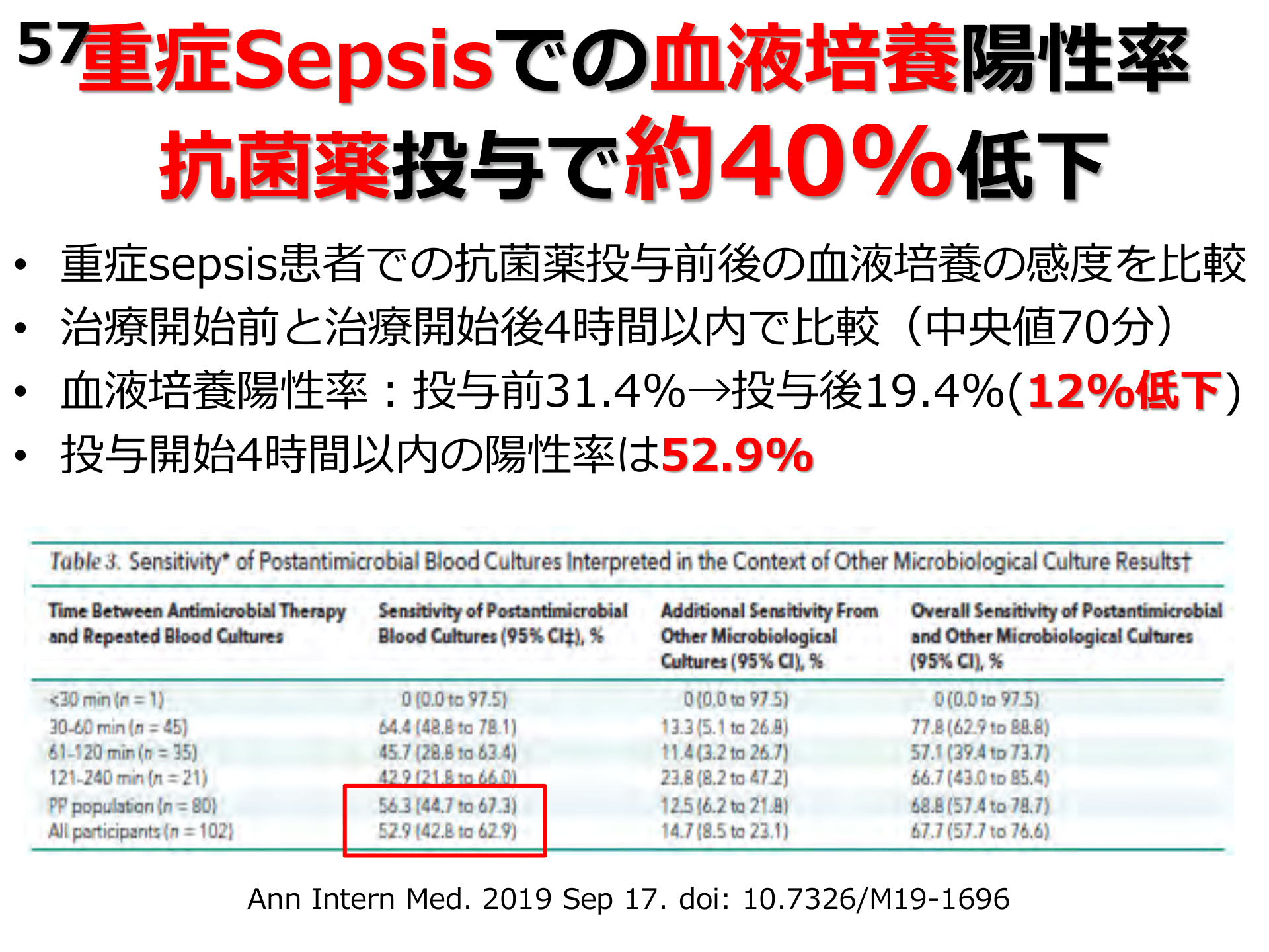 #75. 57重症Sepsisでの血液培養陽性率 抗菌薬投与で約40%低下 • • • • 重症sepsis患者での抗菌薬投与前後の血液培養の感度を比較 治療開始前と治療開始後4時間以内で比較(中央値70分) 血液培養陽性率:投与前31.4%→投与後19.4%(12%低下) 投与開始4時間以内の陽性率は52.9% Ann Intern Med. 2019 Sep 17. doi: 10.7326/M19-1696