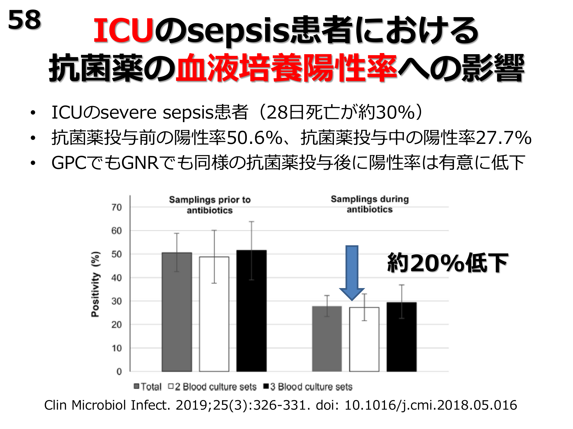 #76. 58 ICUのsepsis患者における 抗菌薬の血液培養陽性率への影響 • ICUのsevere sepsis患者(28日死亡が約30%) • 抗菌薬投与前の陽性率50.6%、抗菌薬投与中の陽性率27.7% • GPCでもGNRでも同様の抗菌薬投与後に陽性率は有意に低下 約20%低下 Clin Microbiol Infect. 2019;25(3):326-331. doi: 10.1016/j.cmi.2018.05.016