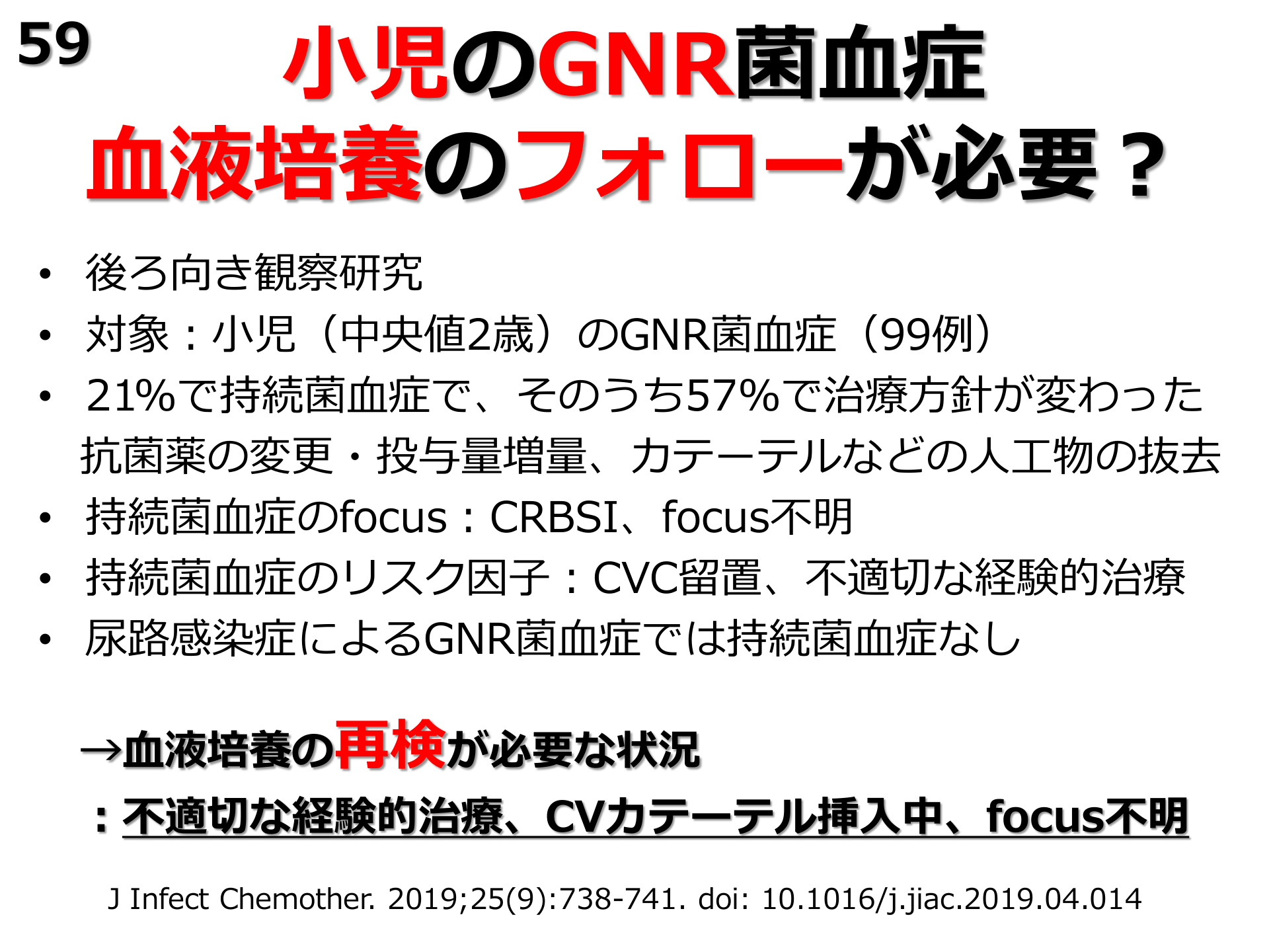 #77. 59 小児のGNR菌血症 血液培養のフォローが必要? • 後ろ向き観察研究 • 対象:小児(中央値2歳)のGNR菌血症(99例) • 21%で持続菌血症で、そのうち57%で治療方針が変わった 抗菌薬の変更・投与量増量、カテーテルなどの人工物の抜去 • 持続菌血症のfocus:CRBSI、focus不明 • 持続菌血症のリスク因子:CVC留置、不適切な経験的治療 • 尿路感染症によるGNR菌血症では持続菌血症なし →血液培養の再検が必要な状況 :不適切な経験的治療、CVカテーテル挿入中、focus不明 J Infect Chemother. 2019;25(9):738-741. doi: 10.1016/j.jiac.2019.04.014